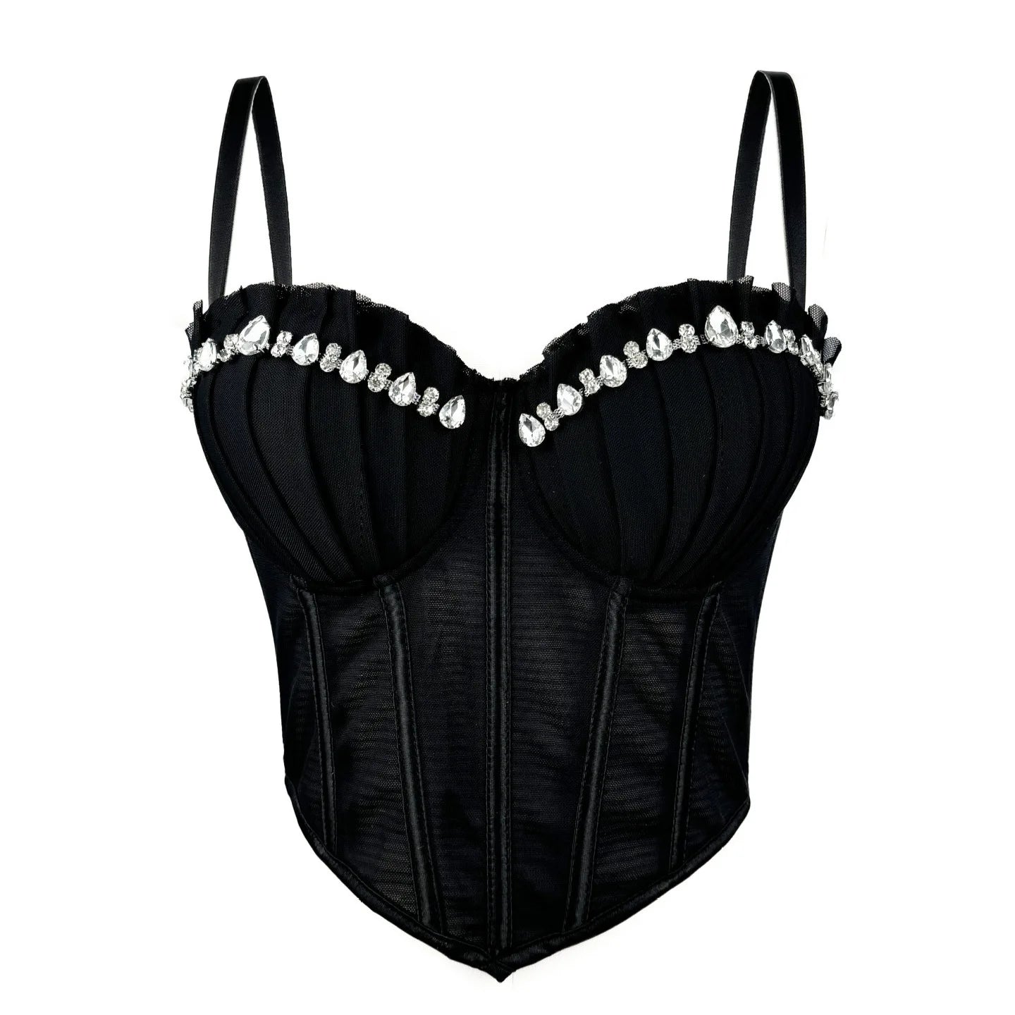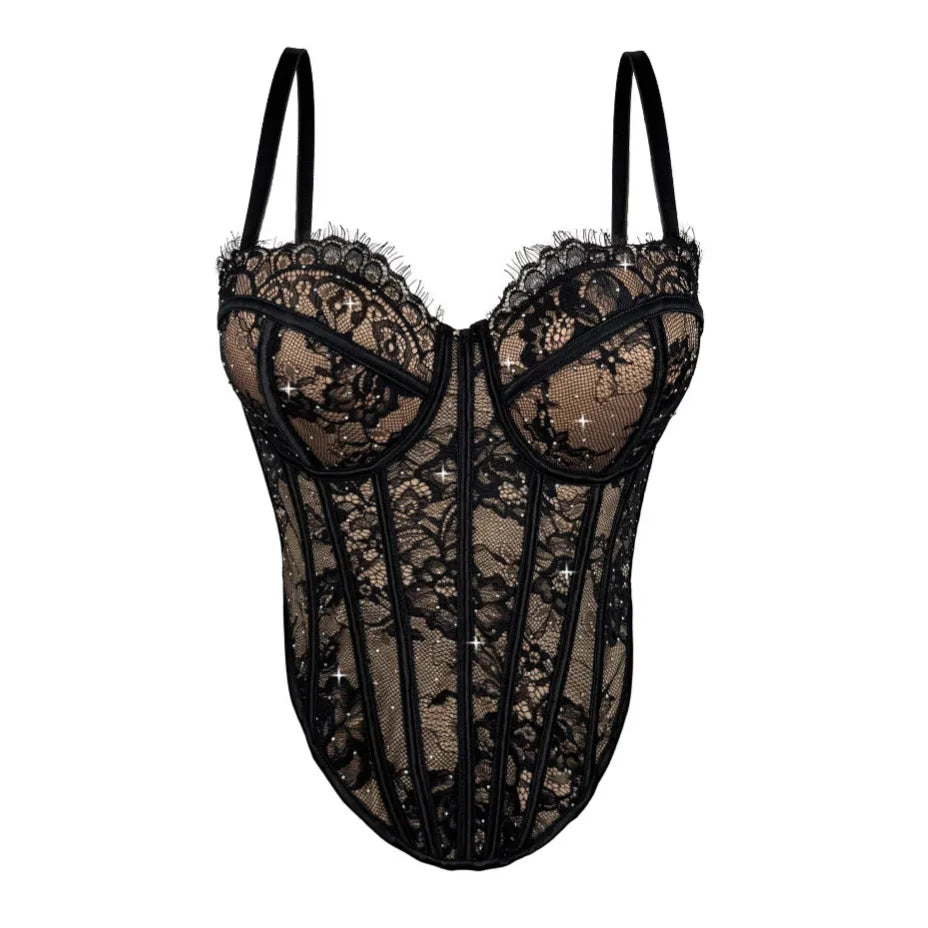 Step into the spotlight with this Alluring clubwear bustier shirt from VacationGrabs. This top is a must-have for nights out and party moments. It hugs your shape with a flattering cut. Thin straps give you steady comfort. Sheer mesh panels add a bold edge to your look. Crystal details shimmer under the lights.