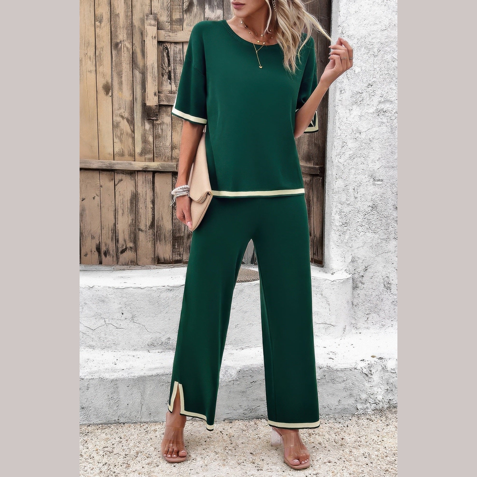 Made from soft knit fabric, this outfit feels light and breathable. You will appreciate the gentle touch on your skin. The wide leg pants bring a modern look. The top's loose cut stays cool in warm weather. This vacation casual knitwear for women is easy to pack and fits well for resort stays or city escapes.