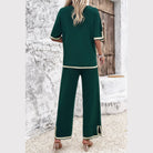 Upgrade your wardrobe with this Two Pieces Outfits Knit Short Sleeve Wide Leg Loun set. This design is for anyone seeking vacation casual knitwear for women that offers both comfort and style. The short sleeve top pairs perfectly with wide leg pants. The relaxed fit allows easy movement whether strolling at the beach or unwinding at home.