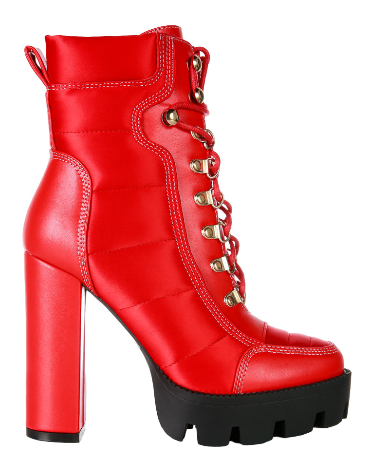 Not just a fashion icon, did you know boots grip and support your ankle for better walking posture? Our Scotch High Heeled Boots are just the boots for the season. These girls boots are rich satin quilted with metallic eyelet detail, which are badass statement boots for any biker babe. These platform heeled boots come with a lightly padded insole and a side zipper opening for optimum comfort and a lug sole giving them a rugged look.