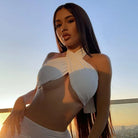 The bandeau includes padded support. This creates a lifted look. Adjustable straps add extra security. The cut showcases your shoulders and collarbone. This summer push up bandeau top comes in both black and white options.