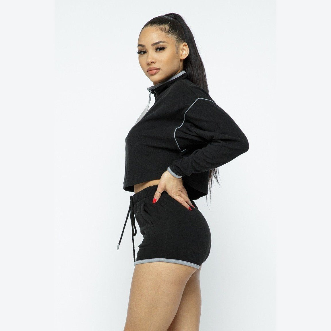 Add the Sporty Crop Top with Zipper Details and High-Waist Shorts in black to your cart now and elevate your active wardrobe with style and comfort!