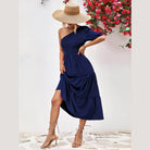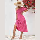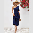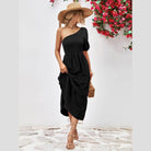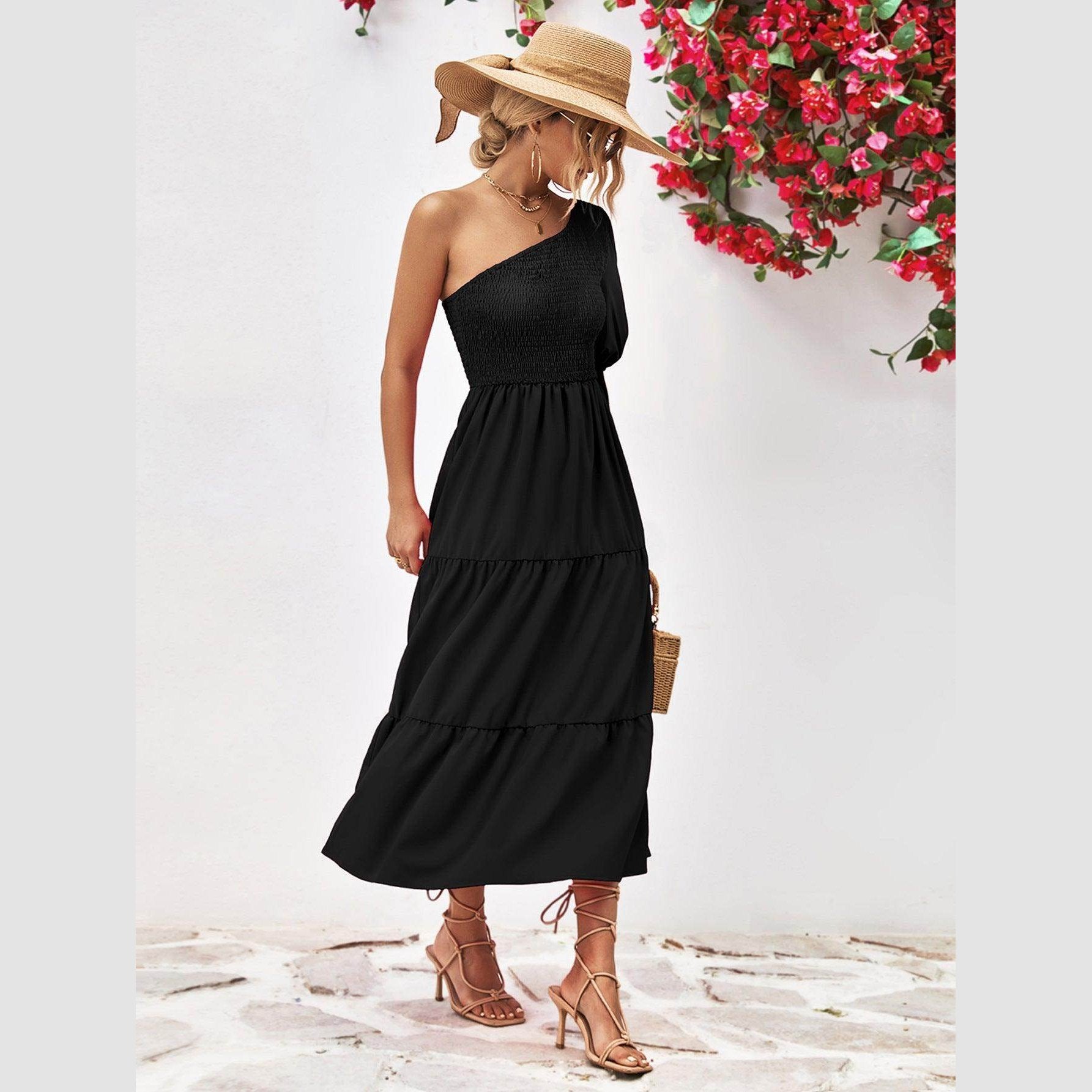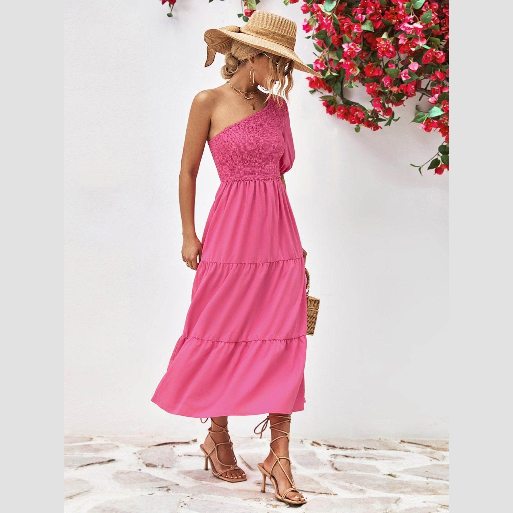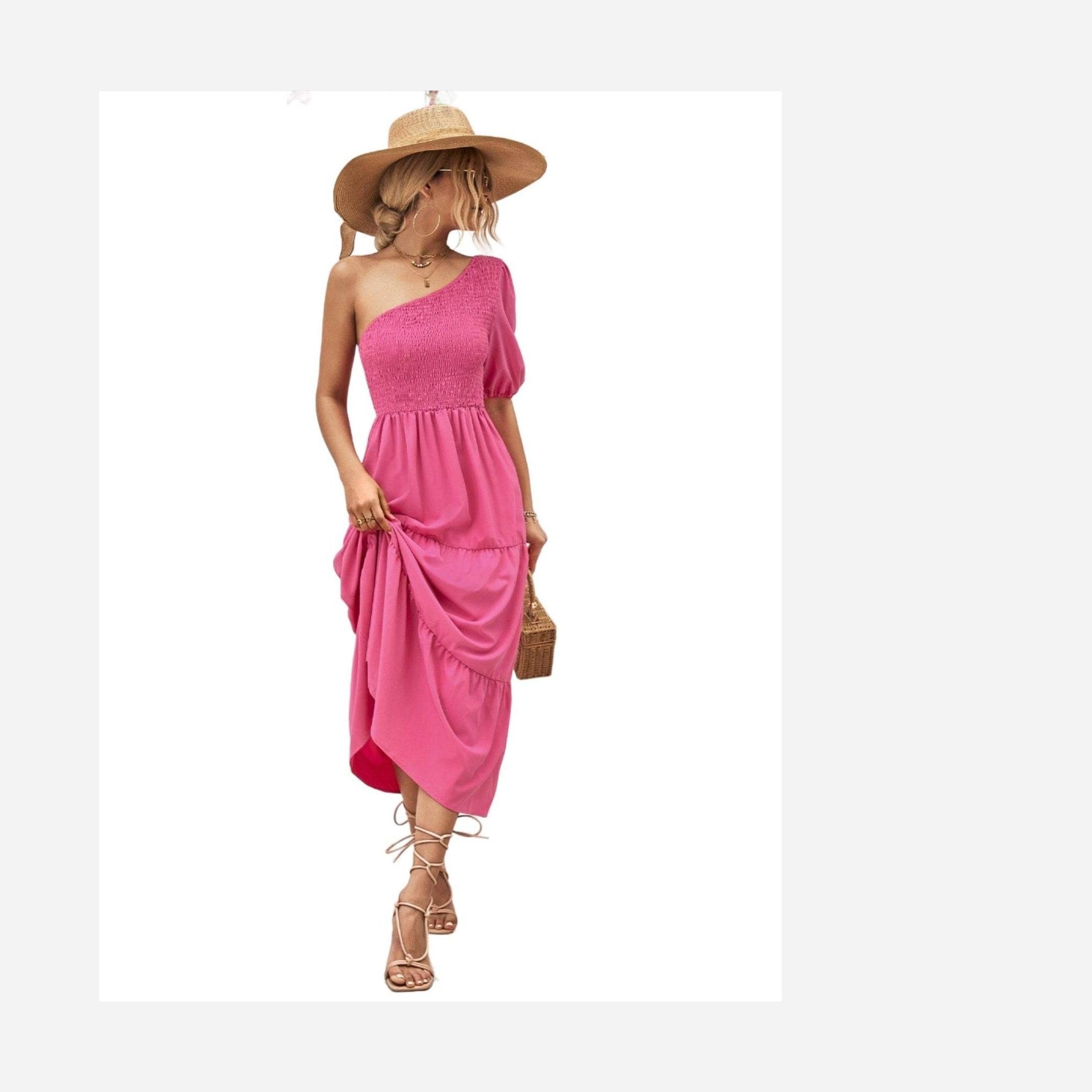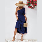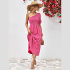 Made with lightweight fabric, this dress ensures comfort without compromising on style. The simple yet eye-catching design is ideal for both day and night events. Whether you're strolling along the beach or attending a summer soirée, this stylish one-shoulder dress promises to make a statement.