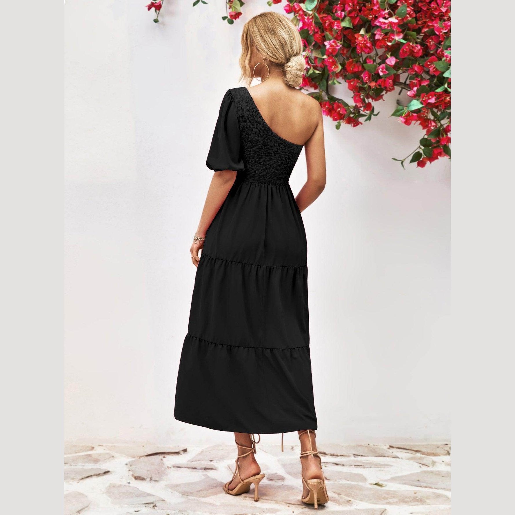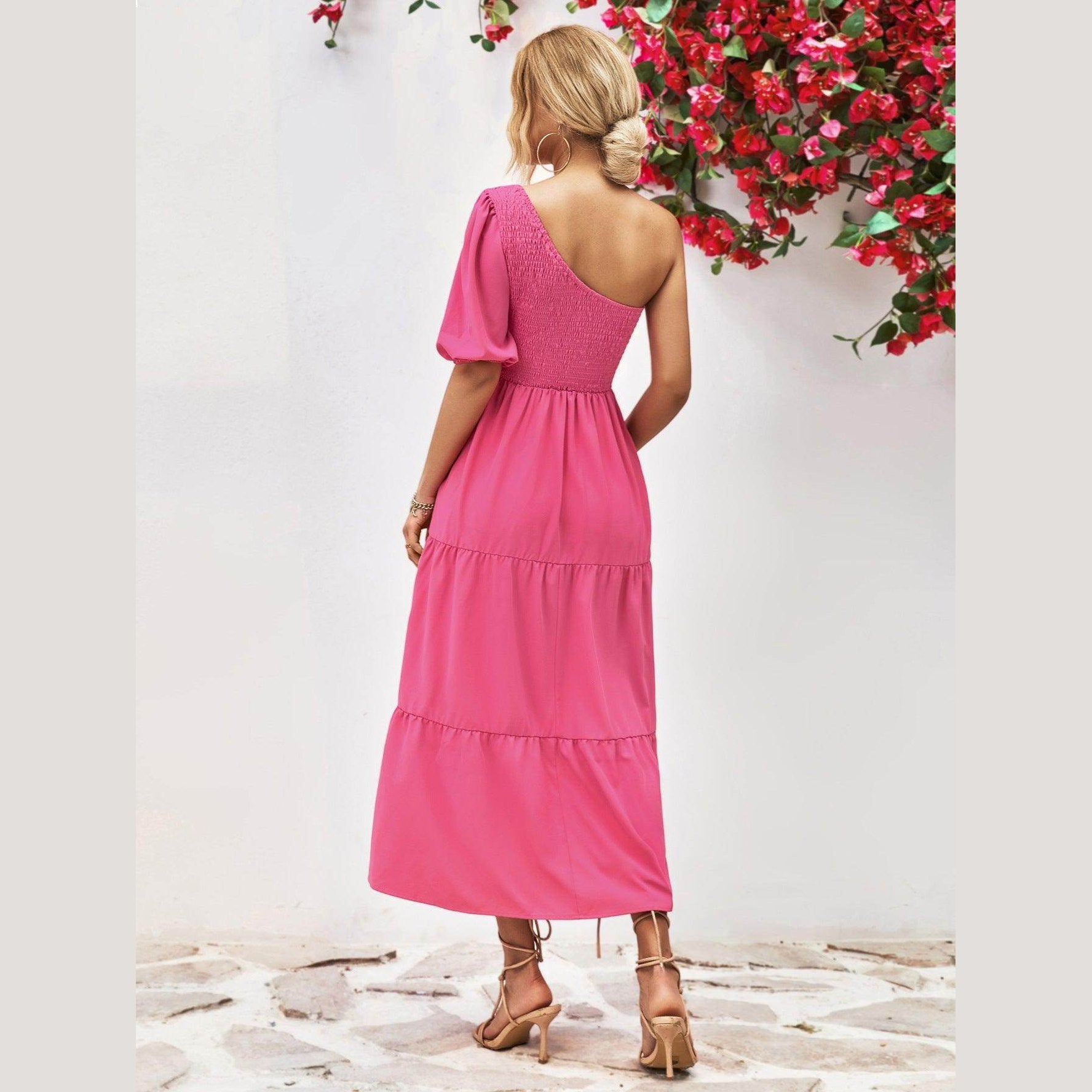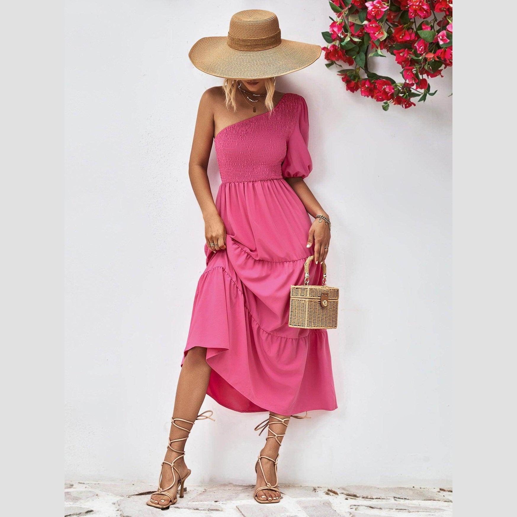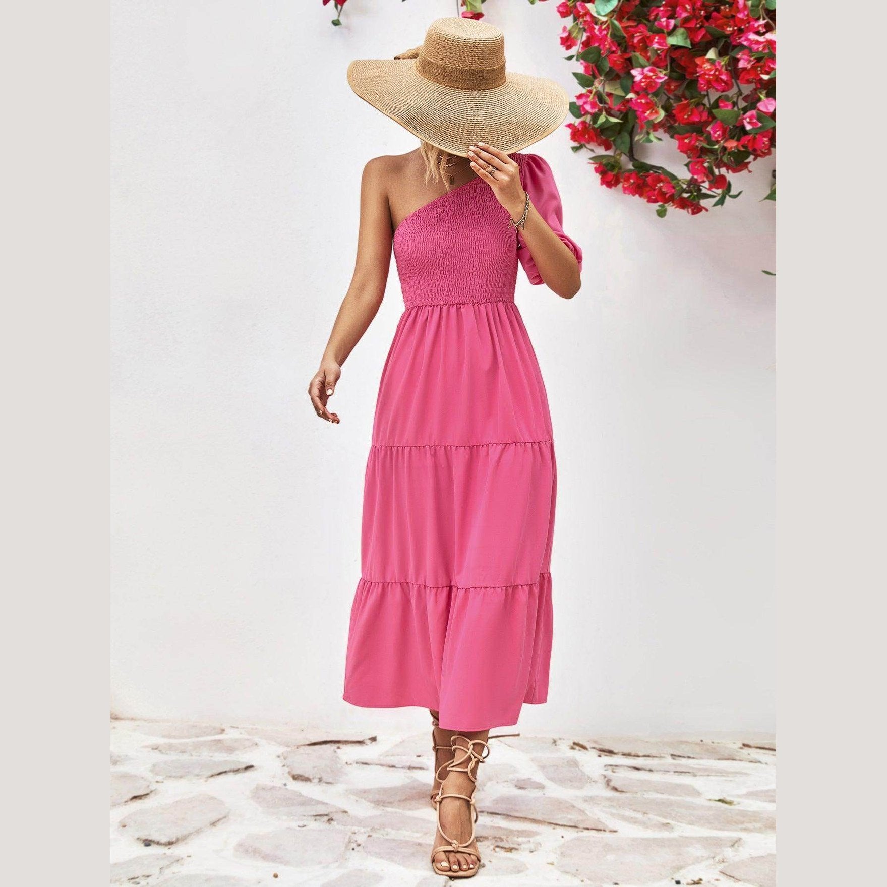 Made with lightweight fabric, this dress ensures comfort without compromising on style. The simple yet eye-catching design is ideal for both day and night events. Whether you're strolling along the beach or attending a summer soirée, this stylish one-shoulder dress promises to make a statement.