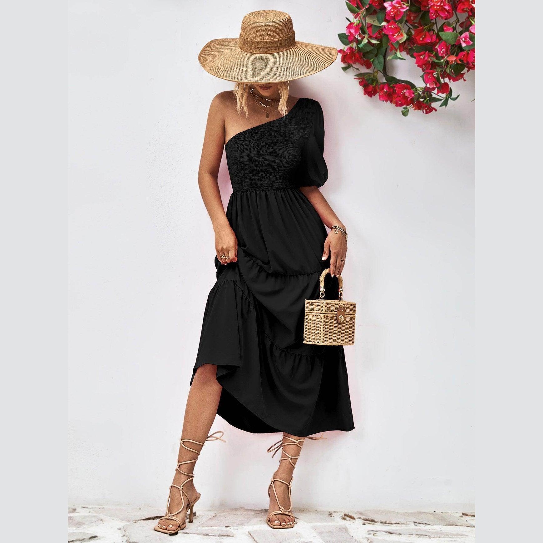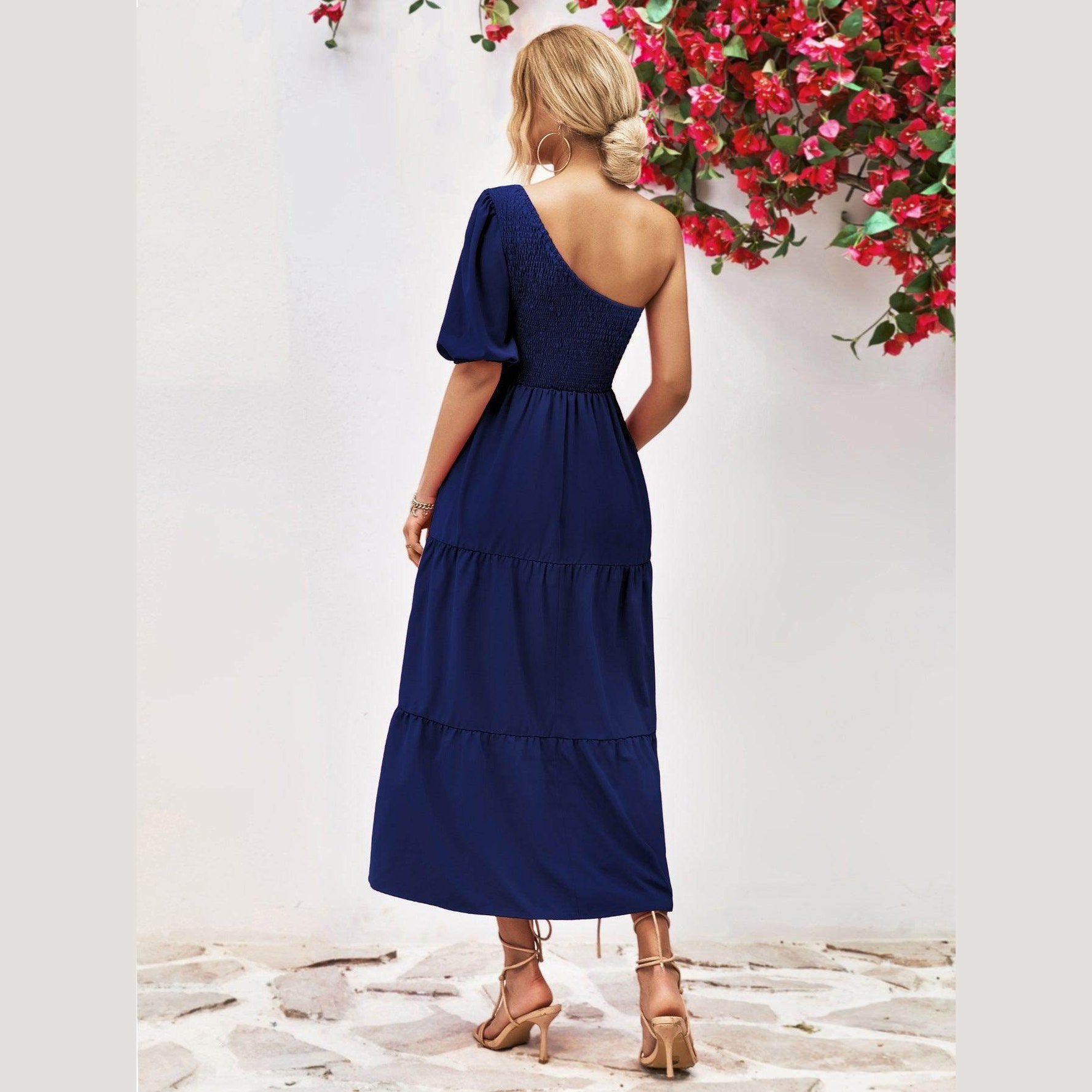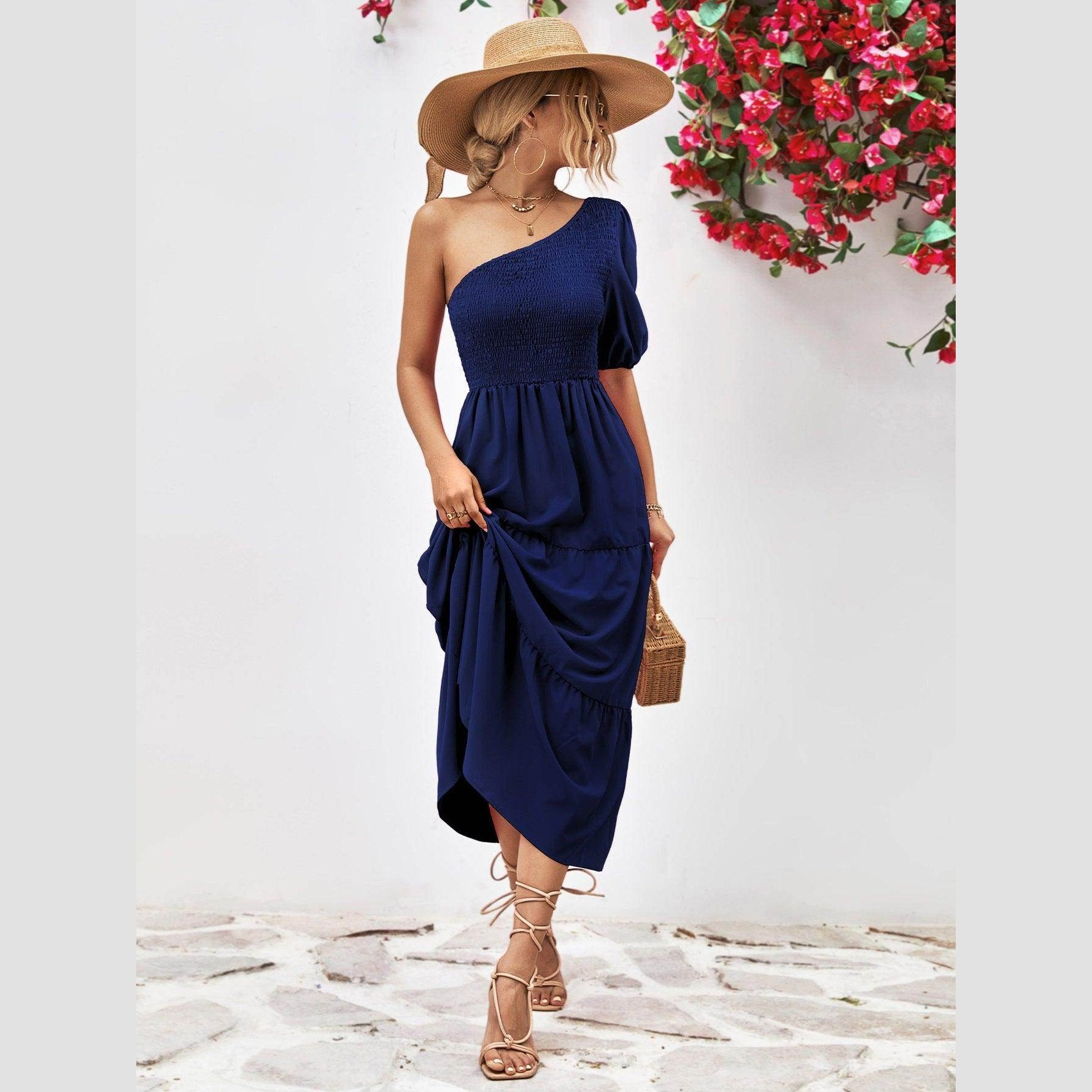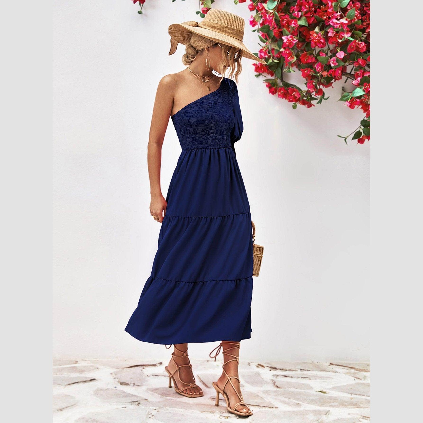 Accessorize your stylish one-shoulder dress with a hat and sandals for a relaxed look. Pair with heels and jewelry for an evening occasion. Versatility is part of its charm, making it a must-have for fashion-forward vacationers.