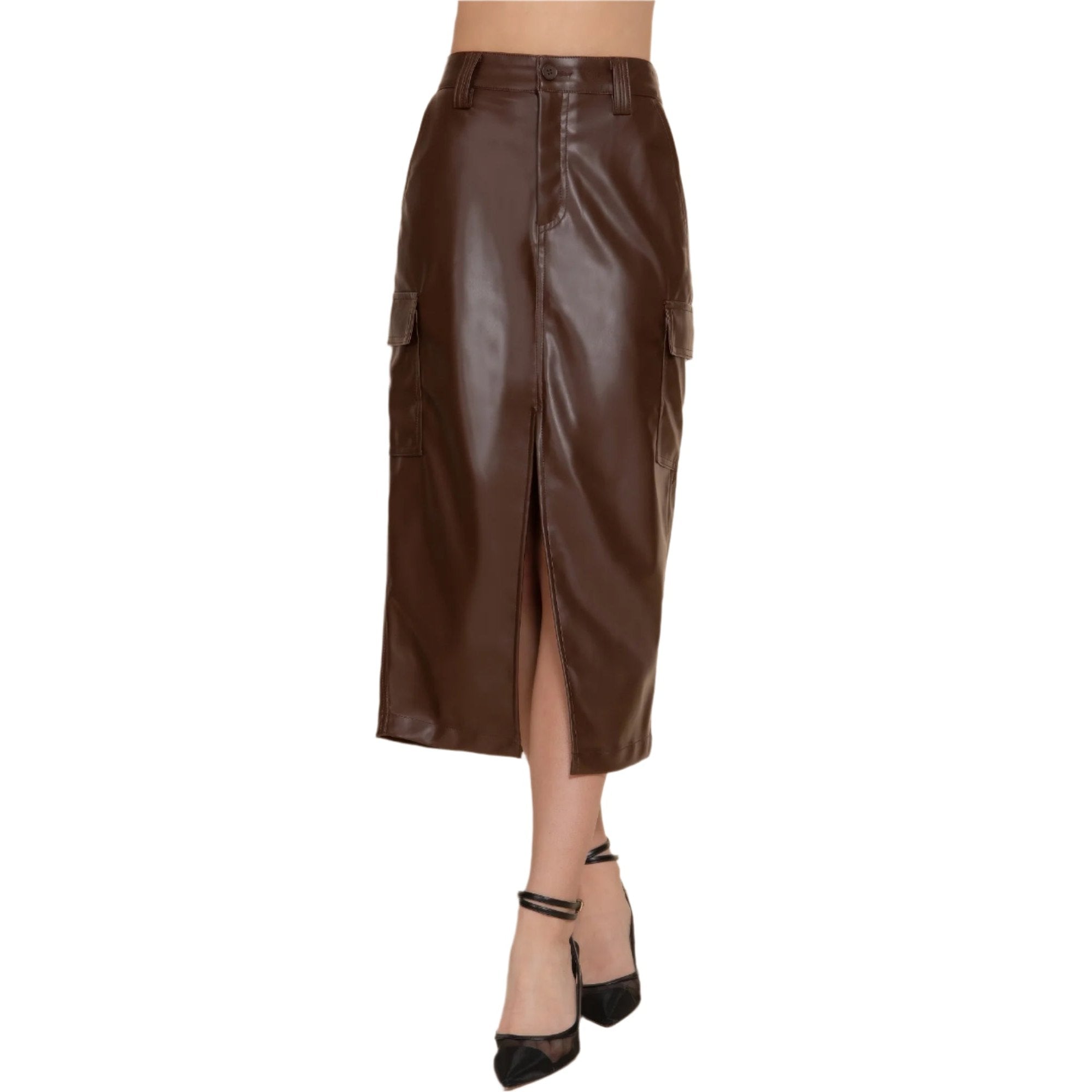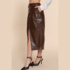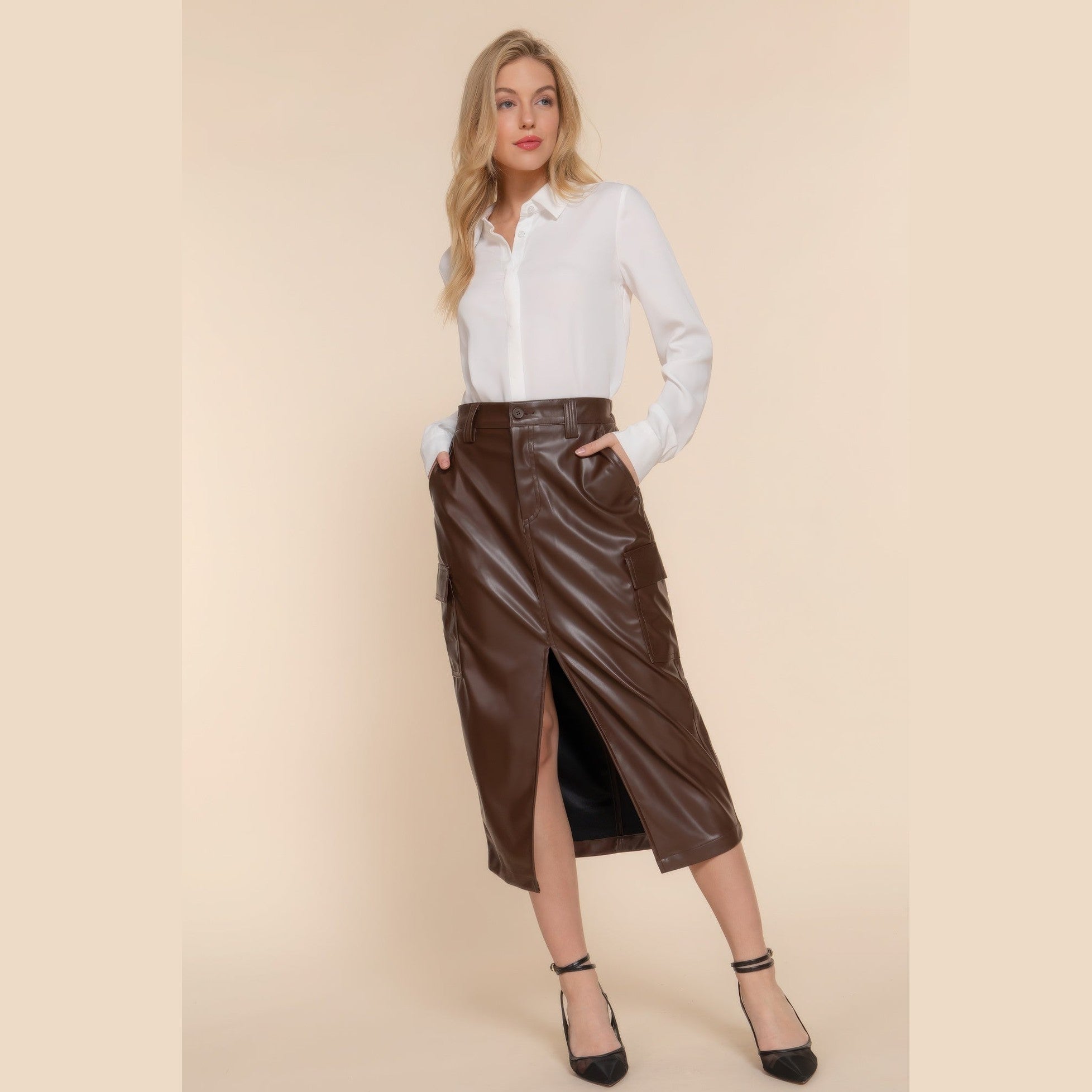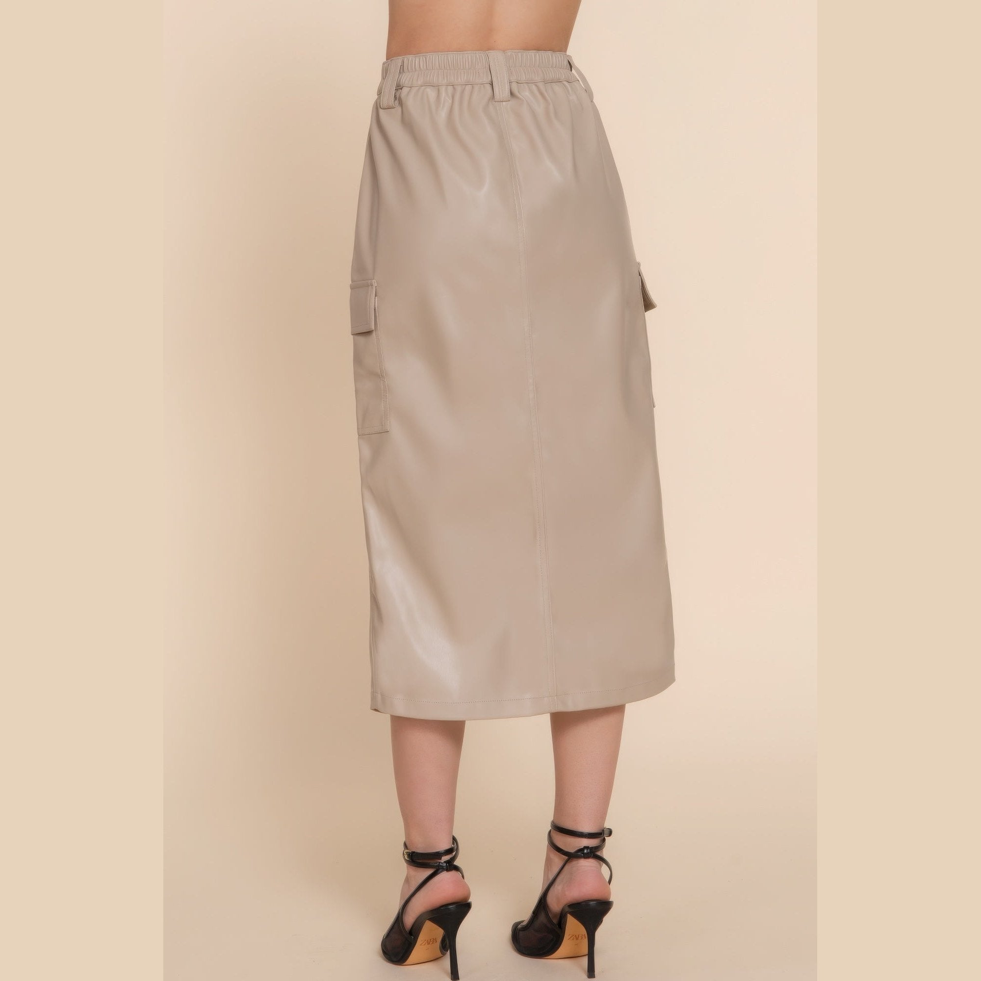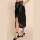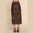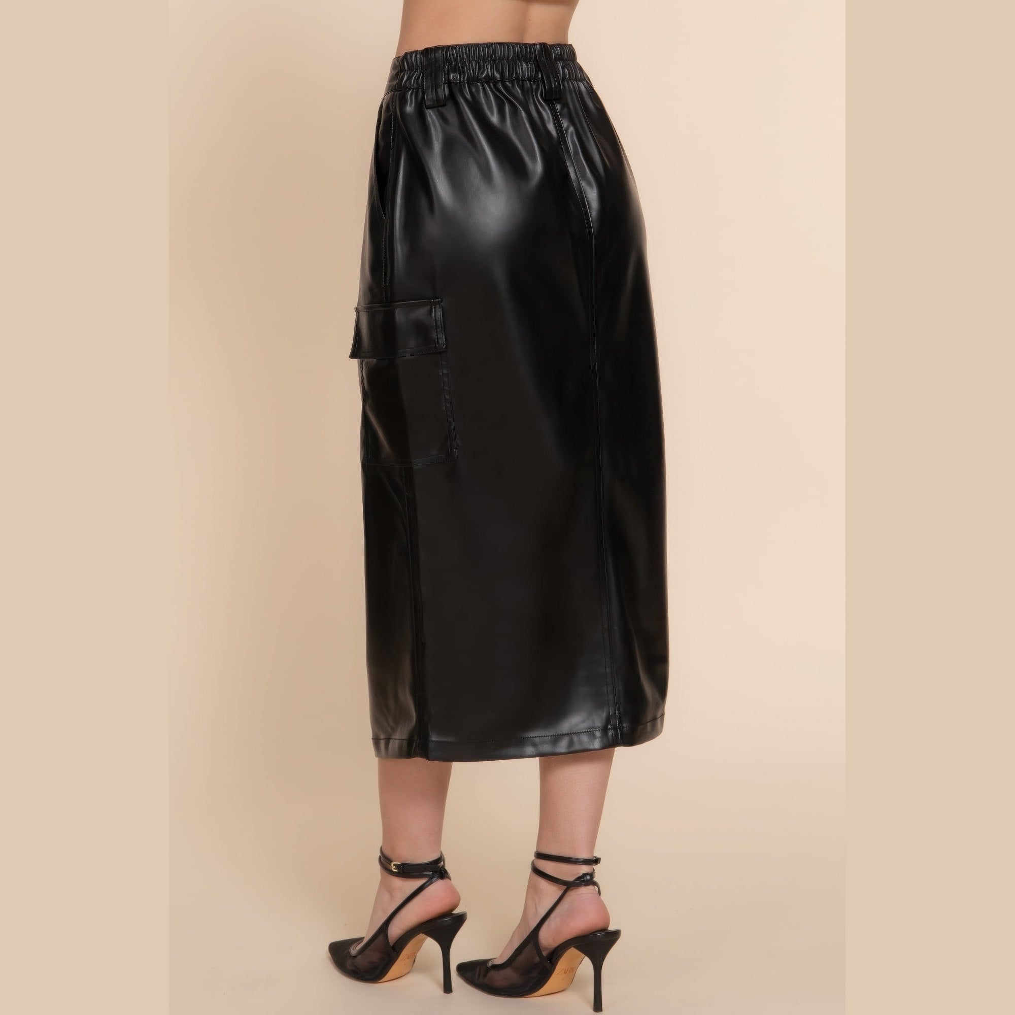 VacationGrabs Vegan Leather Midi Skirt with Pockets