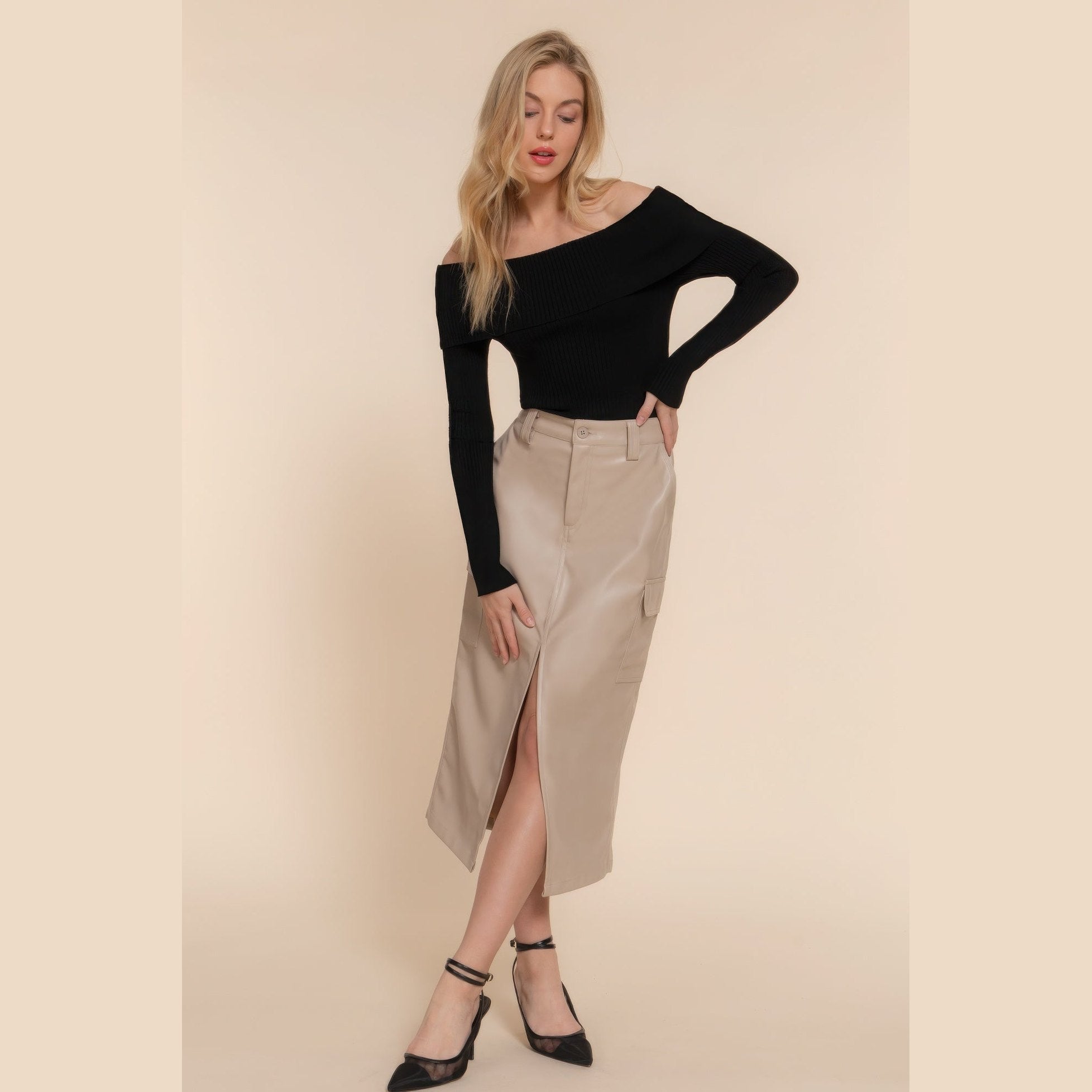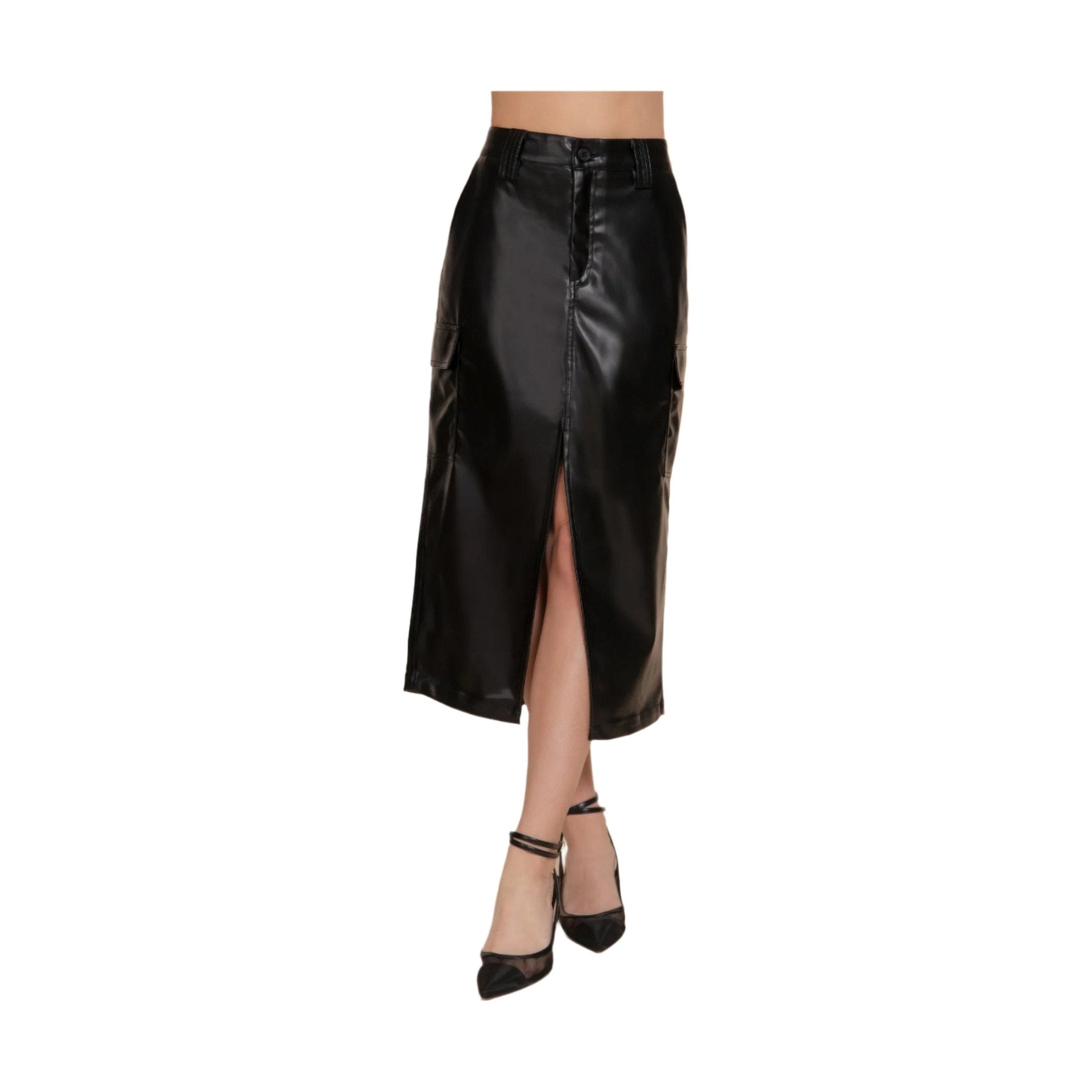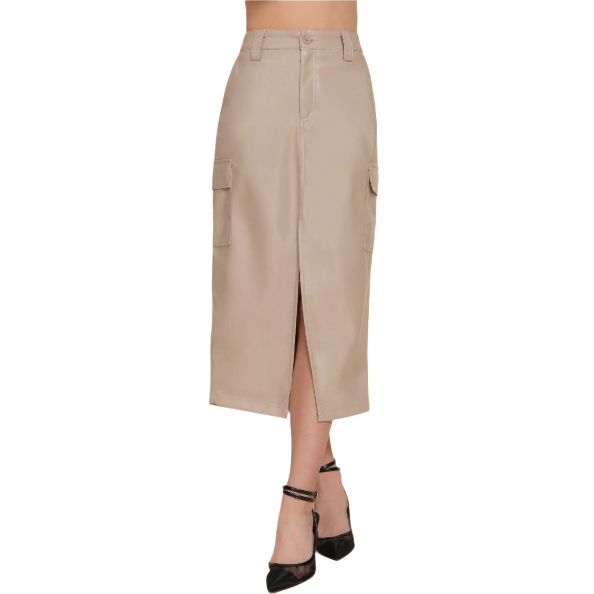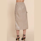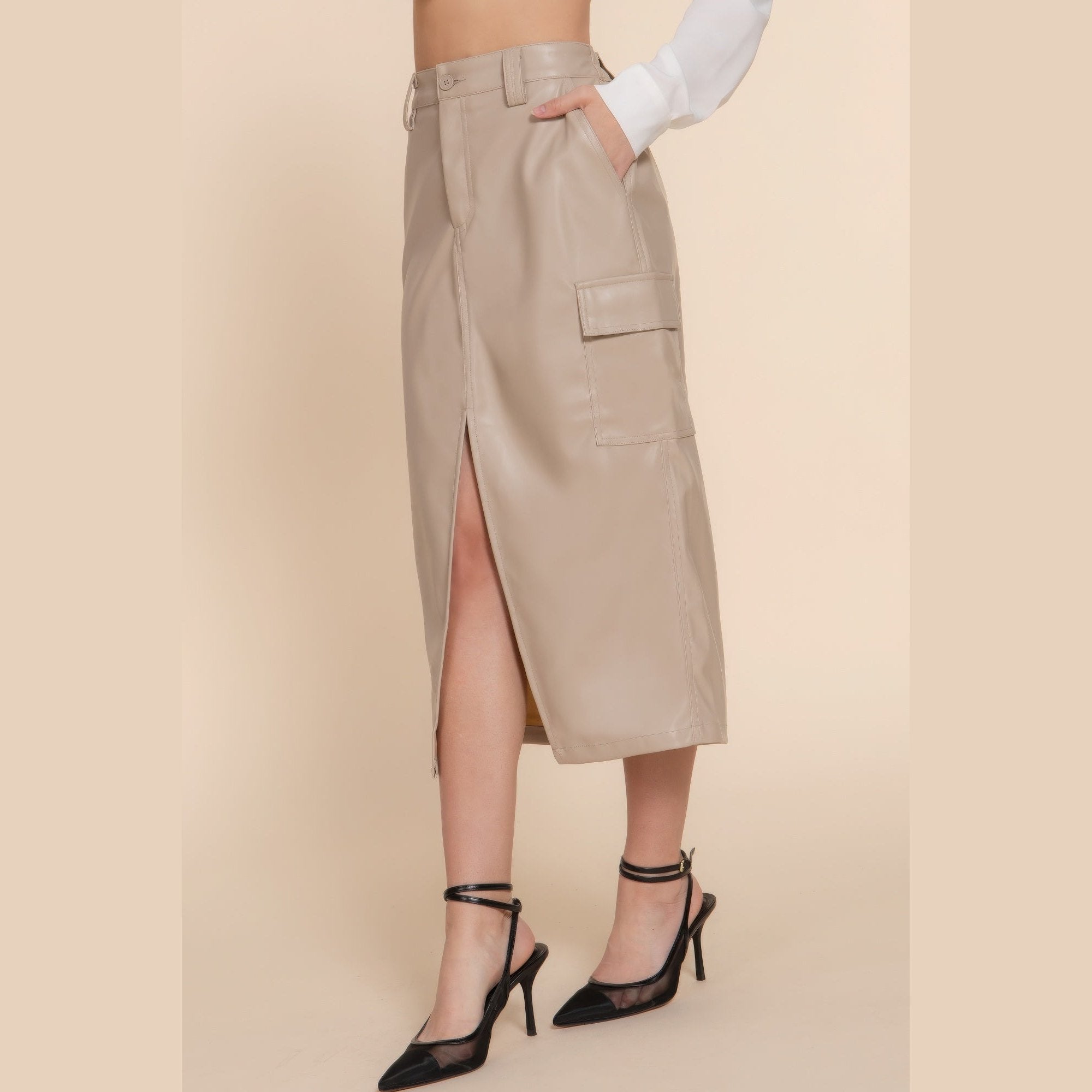 VacationGrabs Vegan Leather Midi Skirt with Pockets
