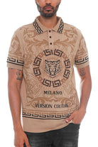 Step into style with the Version Couture Milano shirt from VacationGrabs. This men's shirt has a bold design that stands out in any crowd. Its detailed pattern features a striking tiger motif and iconic gold accents. The shirt comes with a classic polo collar and a crisp button-down front.