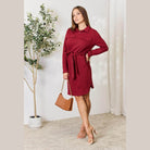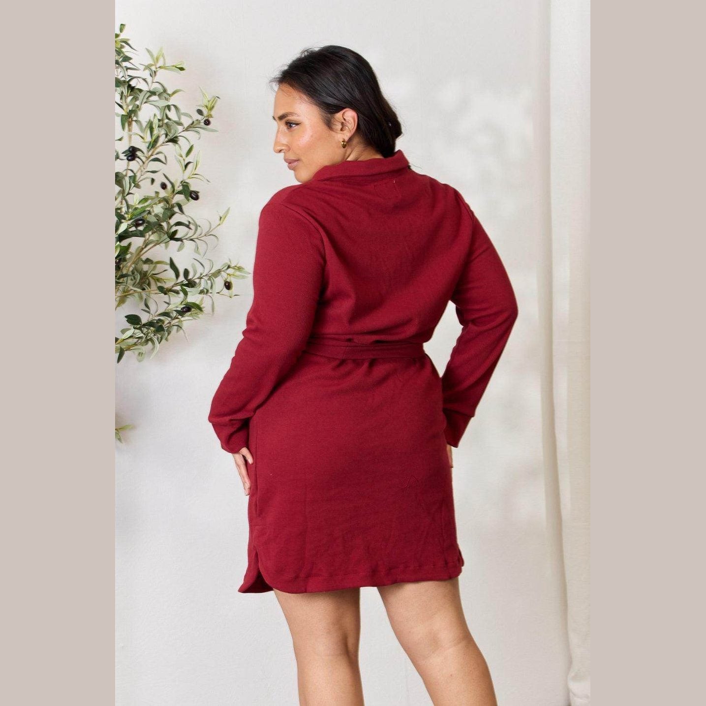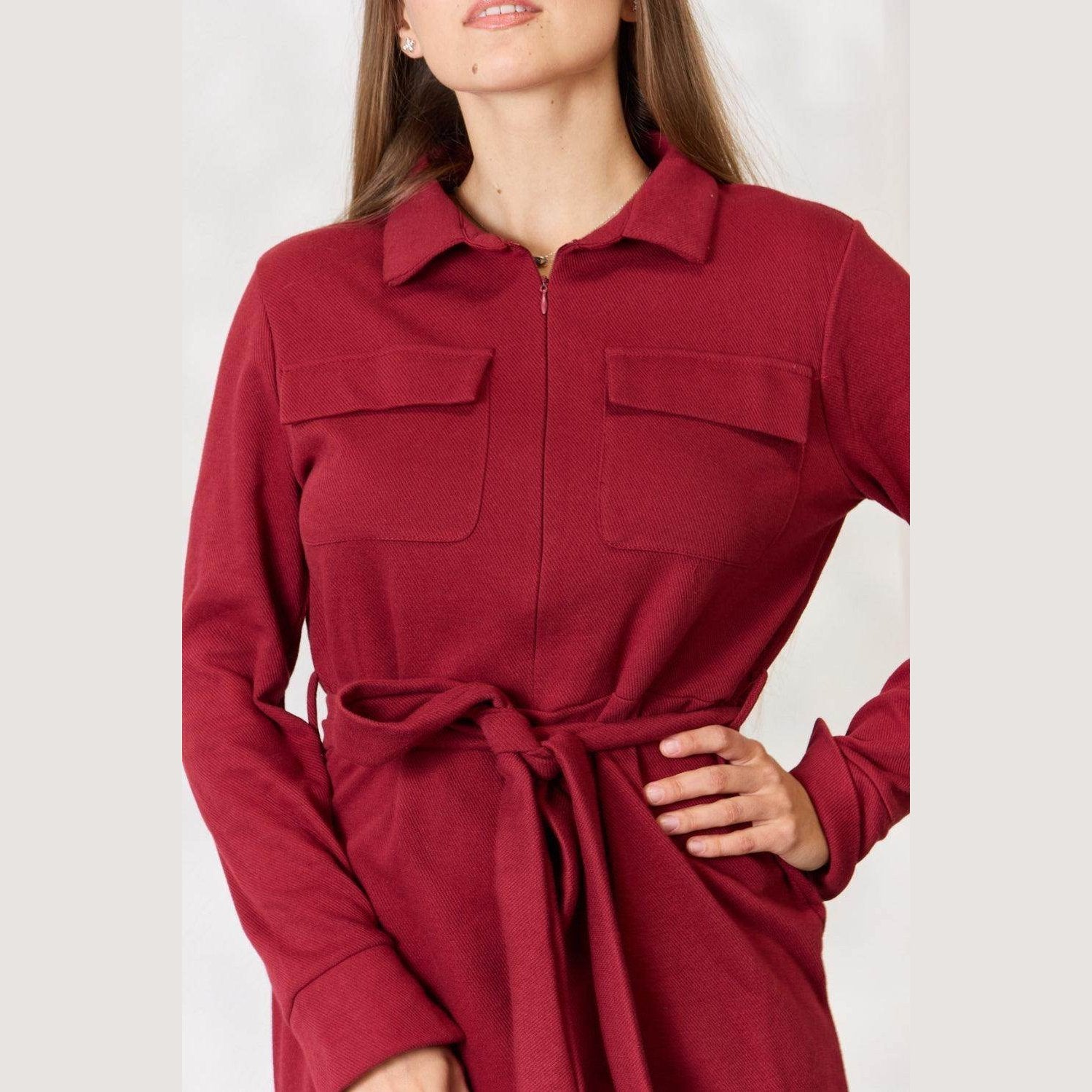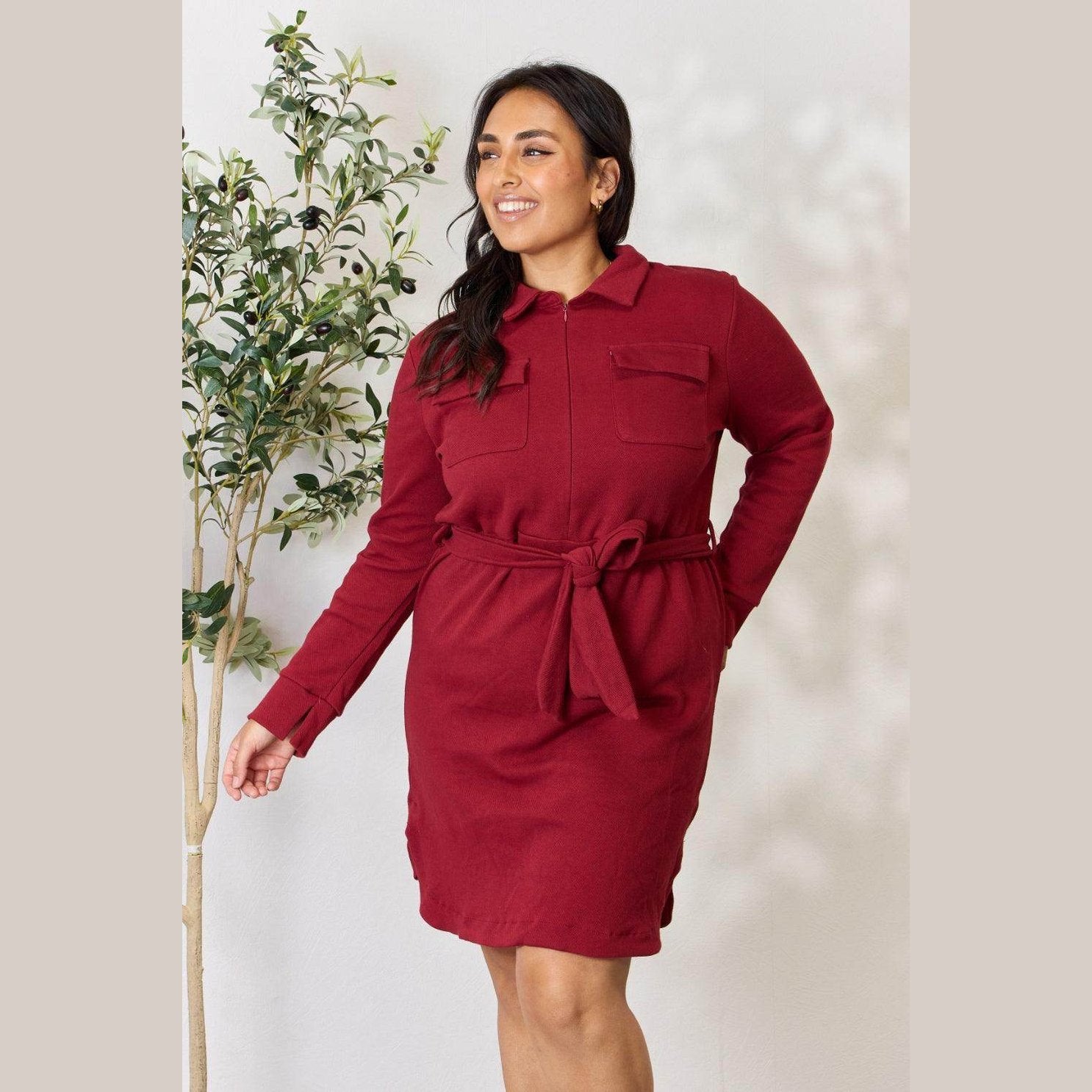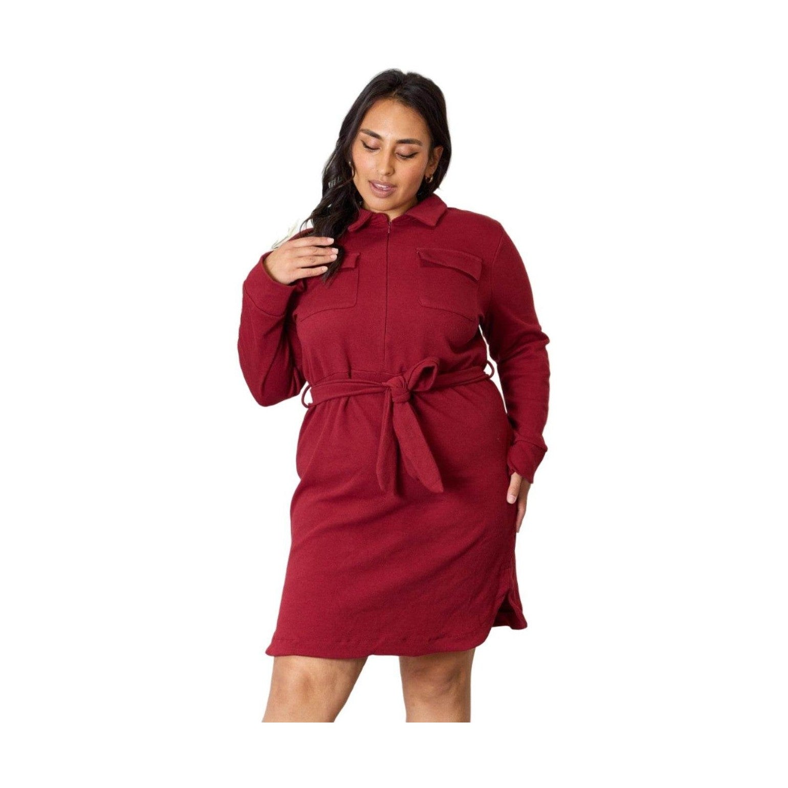This Shirt dress offers a stylish twist on the classic shirt dress. With its half zip detailing and tie front design, this dress achieves the perfect balance between casual and fashionable, making it a must-have for any wardrobe. The long sleeves add a touch of sophistication, making it perfect for transitioning between seasons.