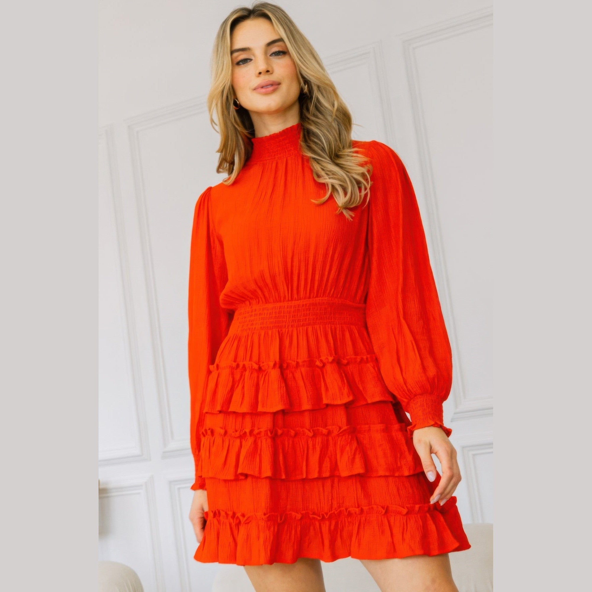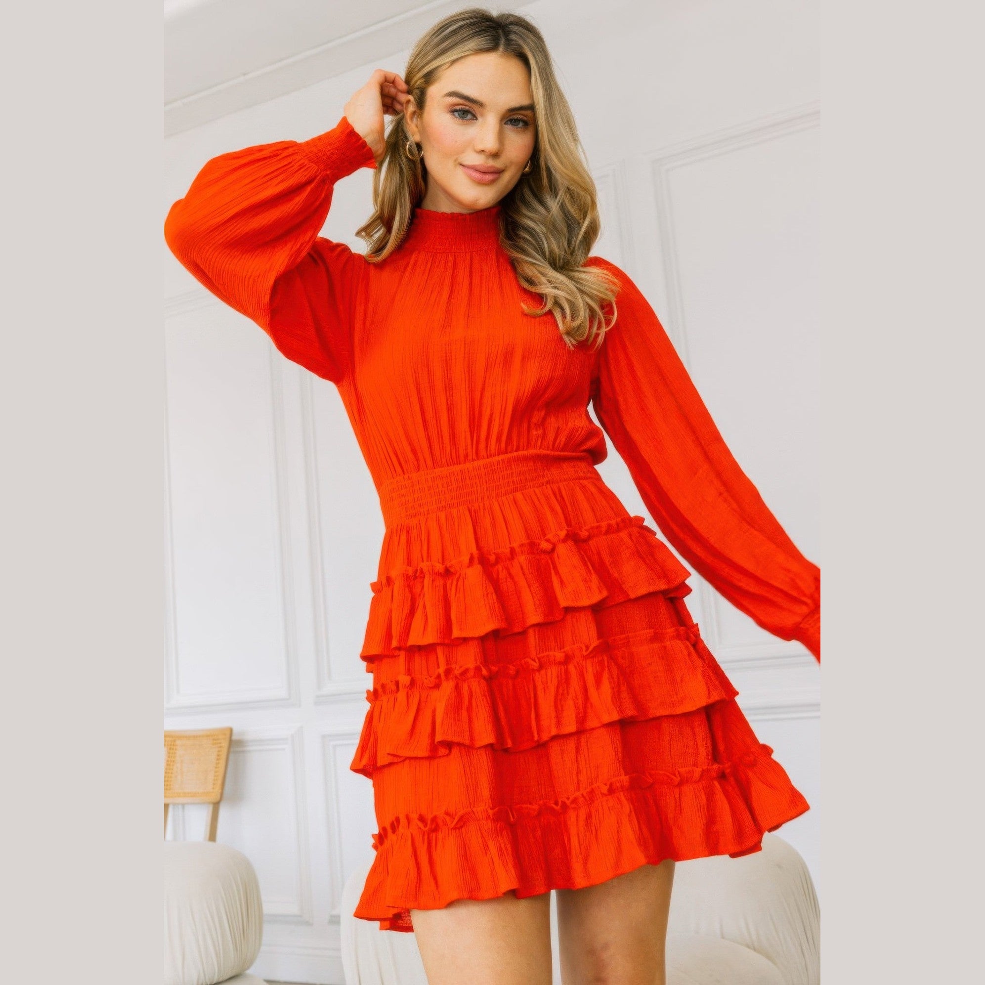 Add a touch of flair to your wardrobe with our Long Sleeve Smocked Neck Tiered Ruffle Mini Dress. Order yours today and enjoy the perfect blend of style and comfort!