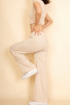 The crop tee is designed to provide maximum breathability while keeping you fashionable. Its soft fabric feels gentle against your skin, making it an ideal choice for warm weather. The wide-leg lounge pants offer an easy fit that flatters every shape. They are perfect for any vacation activity, from morning coffee runs to evening strolls.