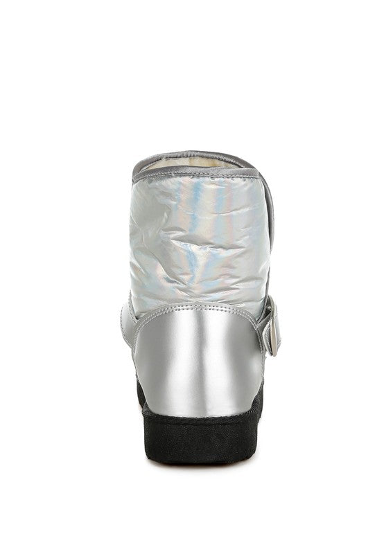 Step into a new season of style with our Jammy Buckle Strap Puffy Ankle Boots. These trendy silver buckle strap boots combine comfort and flair, making them perfect for casual outings or cozy days at home.