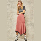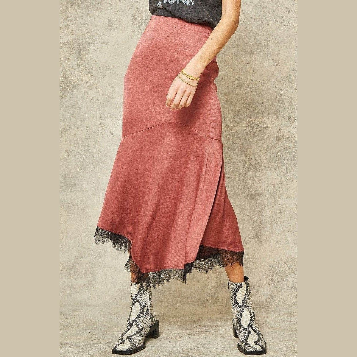 Introducing our Solid Woven Midi Skirt, a sophisticated and chic addition to your wardrobe. This mermaid skirt, crafted from luxurious satin crepe fabric, combines a fitted silhouette with a flared asymmetrical hem and delicate eyelash lace trim for an elegant look.