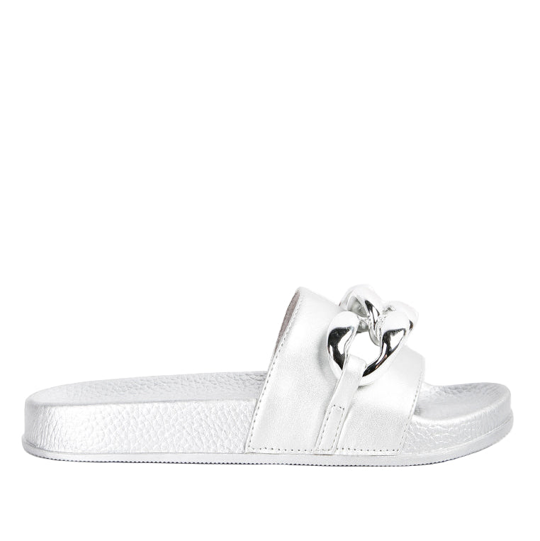 The molded footbed, comfortable platform, and gripping outsole are what make these otherwise beautiful metallic high bling slides utilitarian.