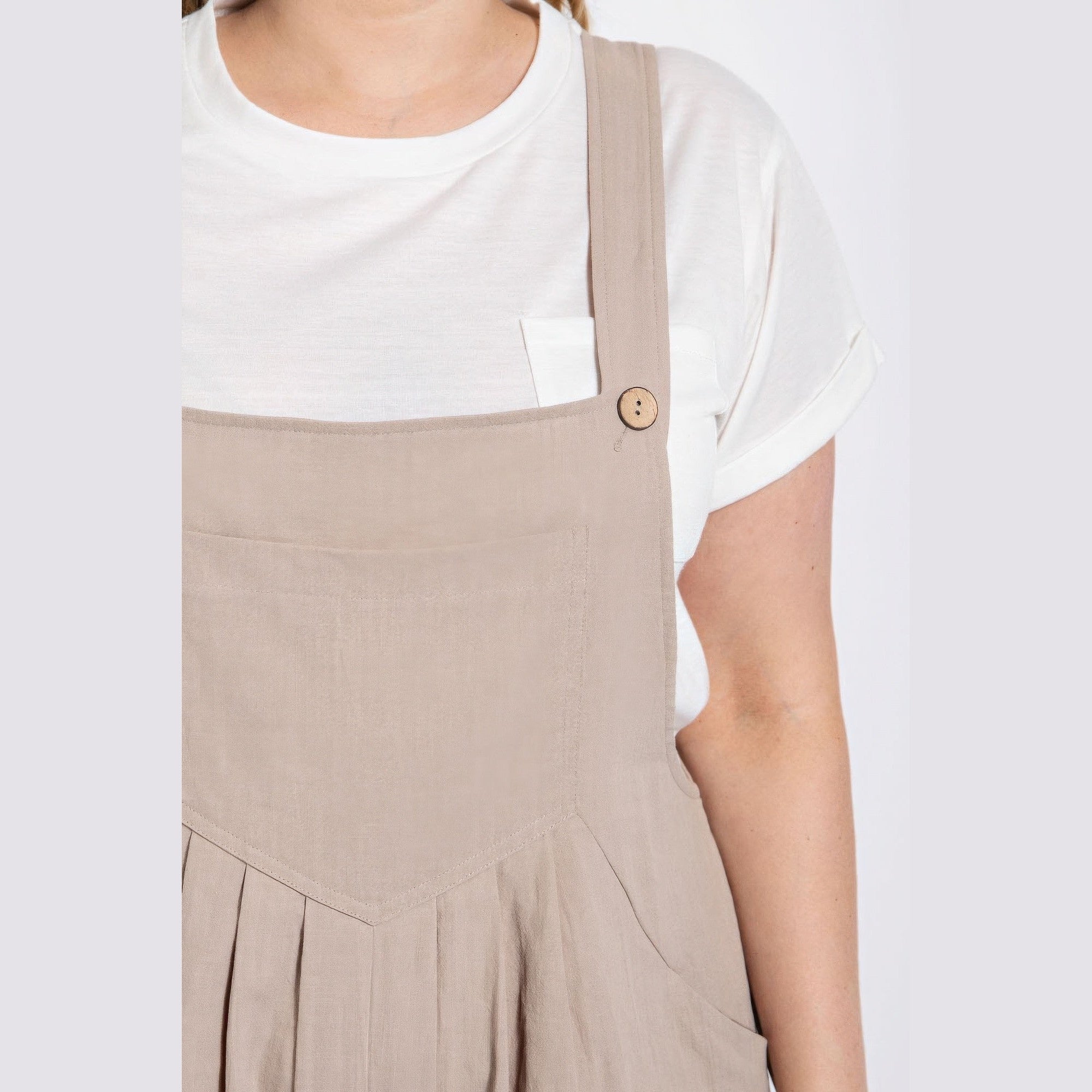 This overall pairs elegant pintuck detailing with practical side pockets, making it a chic and functional addition to your wardrobe. The soft cotton fabric and Stone color provide a modern and versatile option for various outfits.