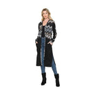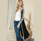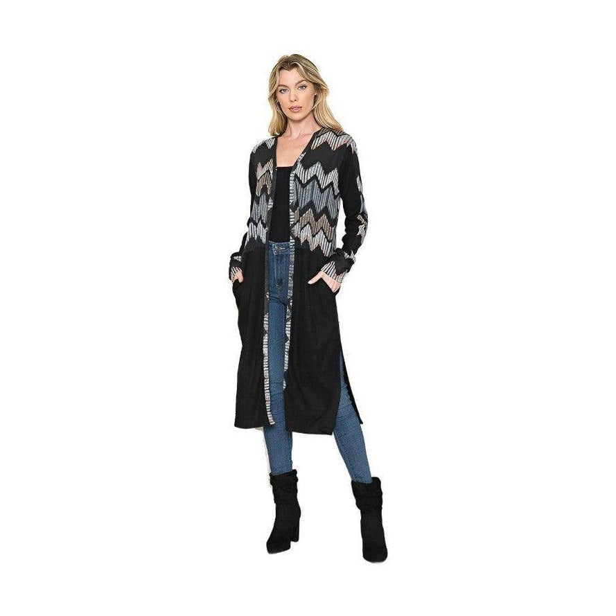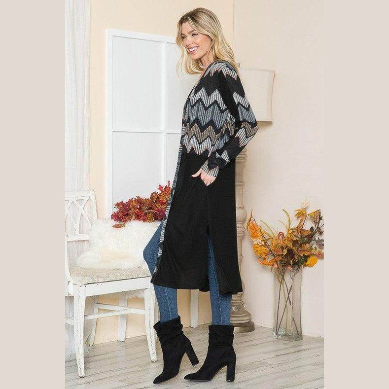 Open front cardigan with side pockets and Side Slits contrasted with print