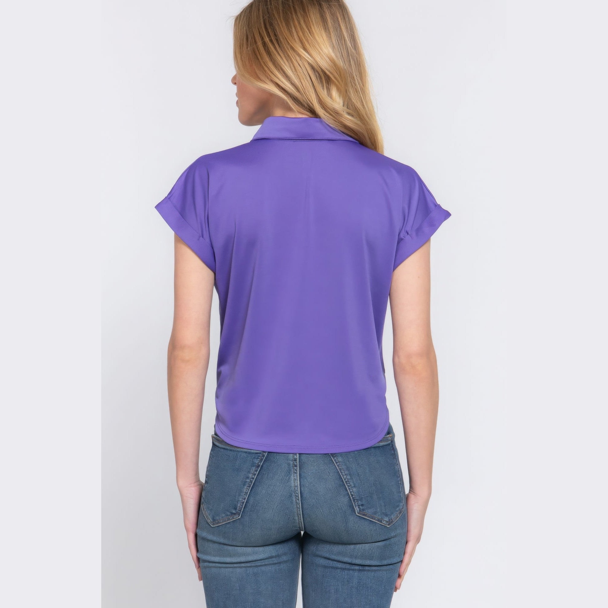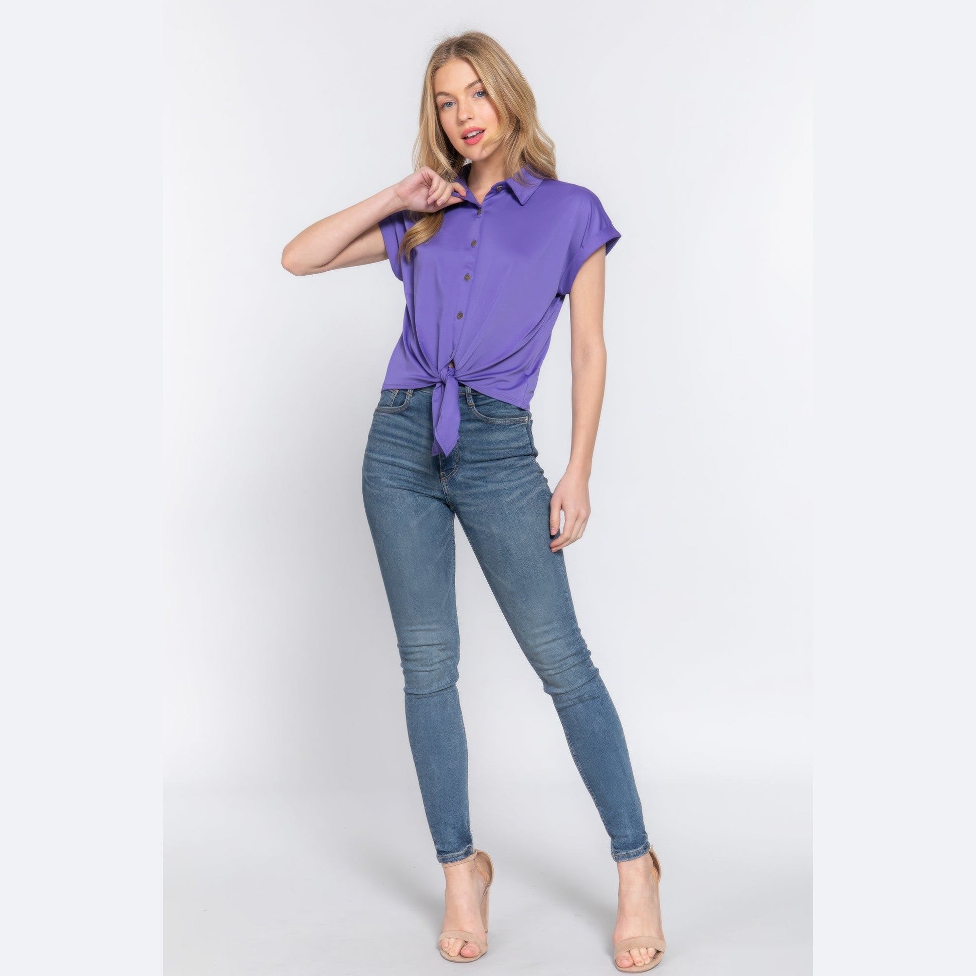 Add our Short Sleeve Front Tie Detail Stretch ITY Top in Purple to your collection today for a stylish and comfortable wardrobe staple!