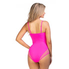 Neon pink one piece with sheer mesh trim, adjustable and removable shoulder straps, and removable soft cups. Moderate to full coverage, super soft microfiber materials.