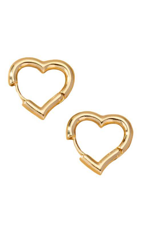 Heart shape hinged huggie hoop earrings. Made of brass. Shiny gold plating.