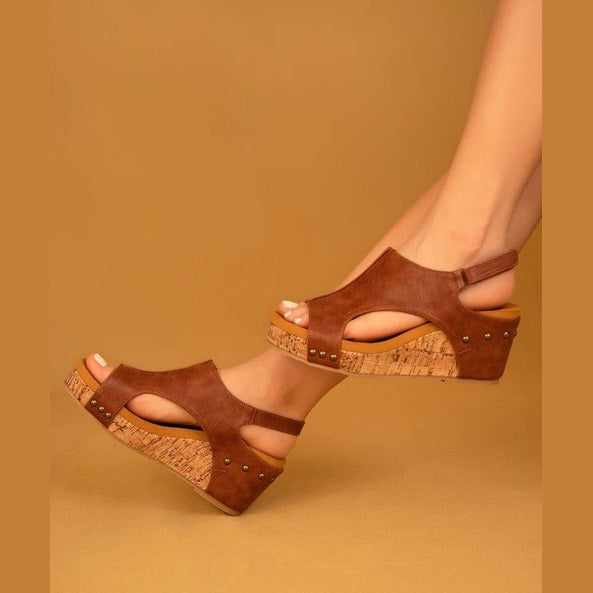 The cork sole summer sandals have a natural look that works with any vacation outfit. The platform wedge adds just the right amount of height while staying comfortable. Metallic hardware details add a touch of elegance. The outsole is sturdy and gives good grip on different surfaces.