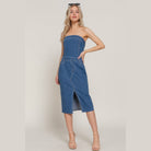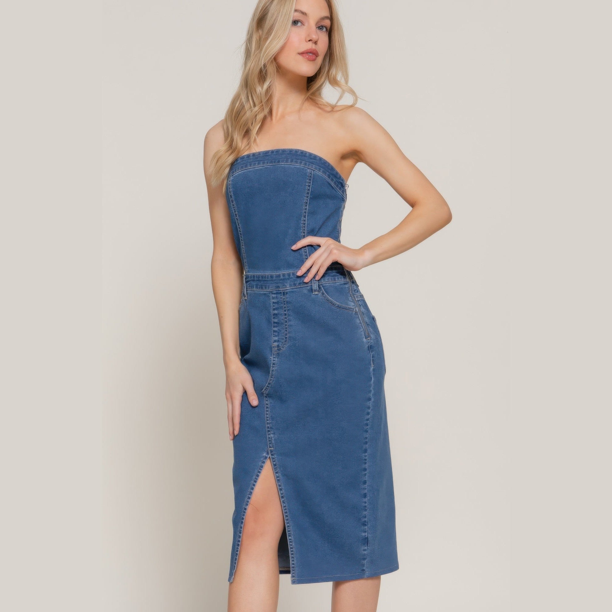 Add the Stretch Denim Slit Tube Dress in Denim Blue to your wardrobe today and experience a perfect blend of style, comfort, and versatility!