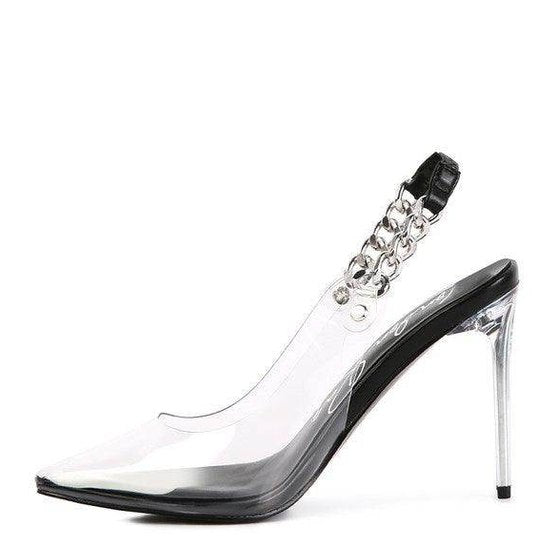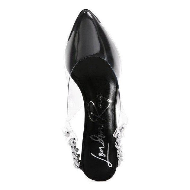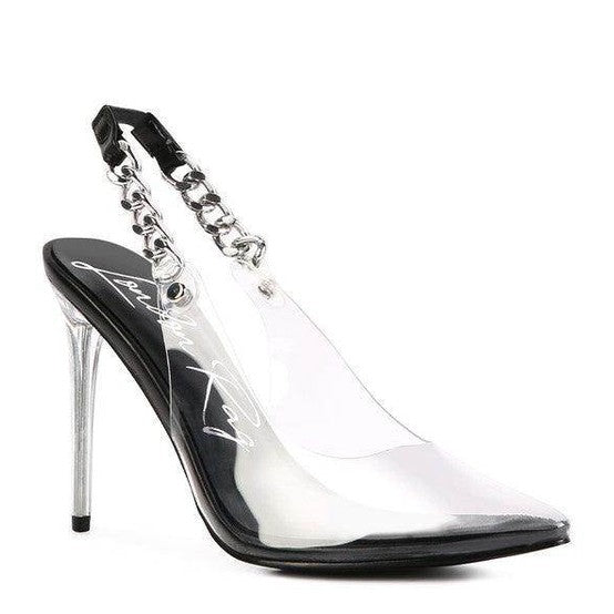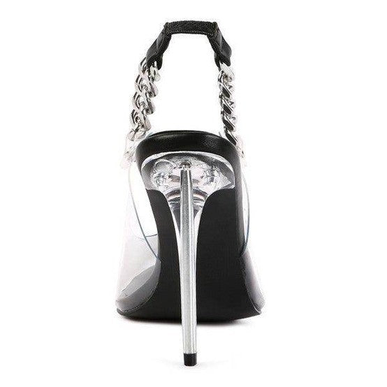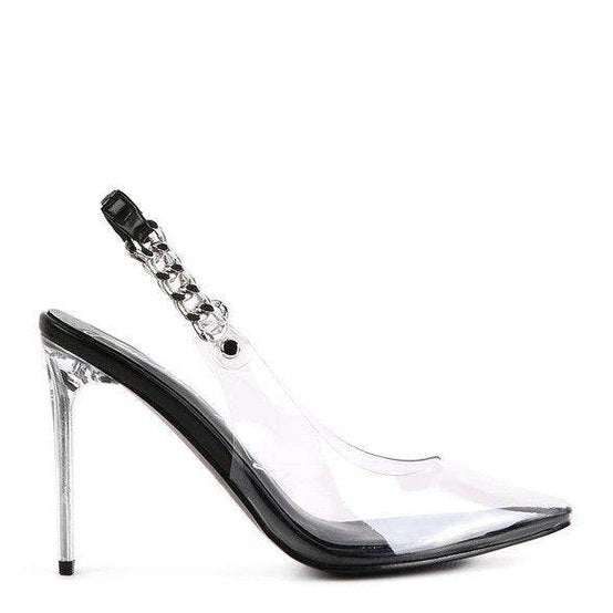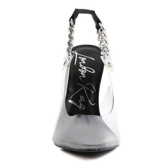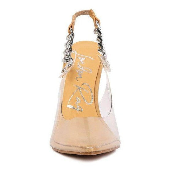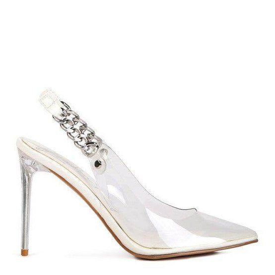 High Heeled Clear Sandals which are trendy styles showing all skin and keeping bare minimum color on the feet. It has elasticated slingback with metal chain detail which hold to the feet well.