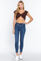 Elevate your style with our Short Sleeve V-Neck Front Knot Detail Sweater Knit Crop Top in Chocolate. Add it to your cart now and experience the perfect blend of fashion and comfort!