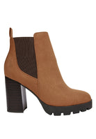 Tan block heeled boots with elasticated gussets. The easy to wear slip-on style is a stylish and trending pick!