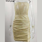Step into the spotlight with the Alluring ruched bodycon club dress from VacationGrabs. The silvery glitter fabric catches the light at every angle. This mini short dress hugs your curves. The strapless design adds an elegant touch. You will feel confident walking into any summer party.
