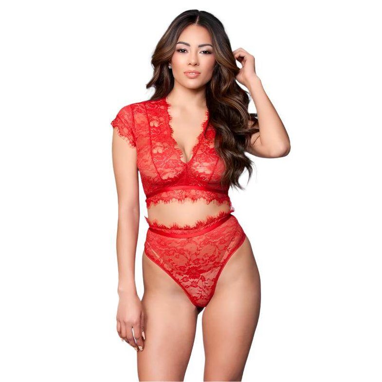 Reveal your wild side with this 2 piece set that features sheer floral lace. This flattering set provides a blend of seduction and comfort.