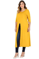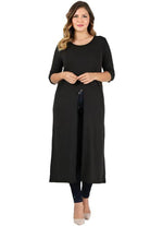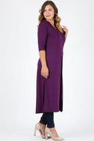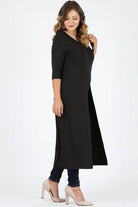 * Solid, long body top in a relaxed fit, with 3/4 sleeves, a round neck, and high front slit.