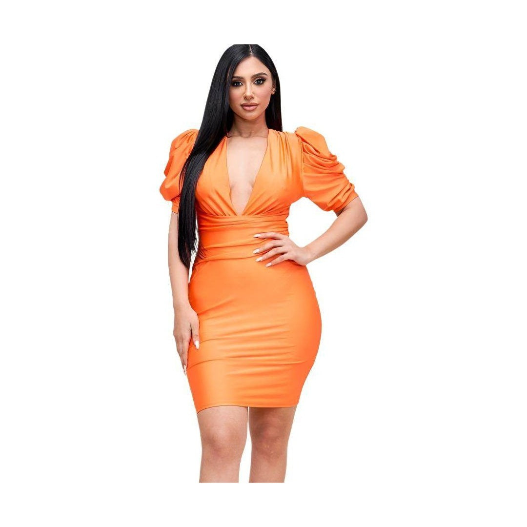 Learn more about our Solid Short Puff Sleeve Dress With Plunged V Neck Line at VacationGrabs: