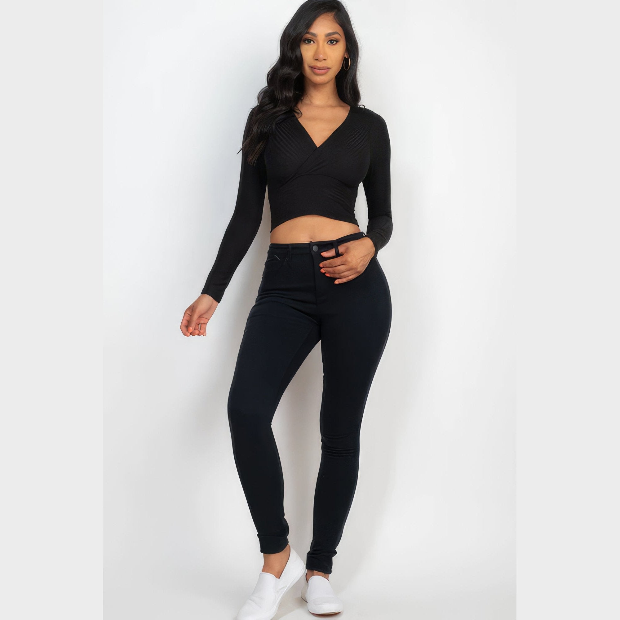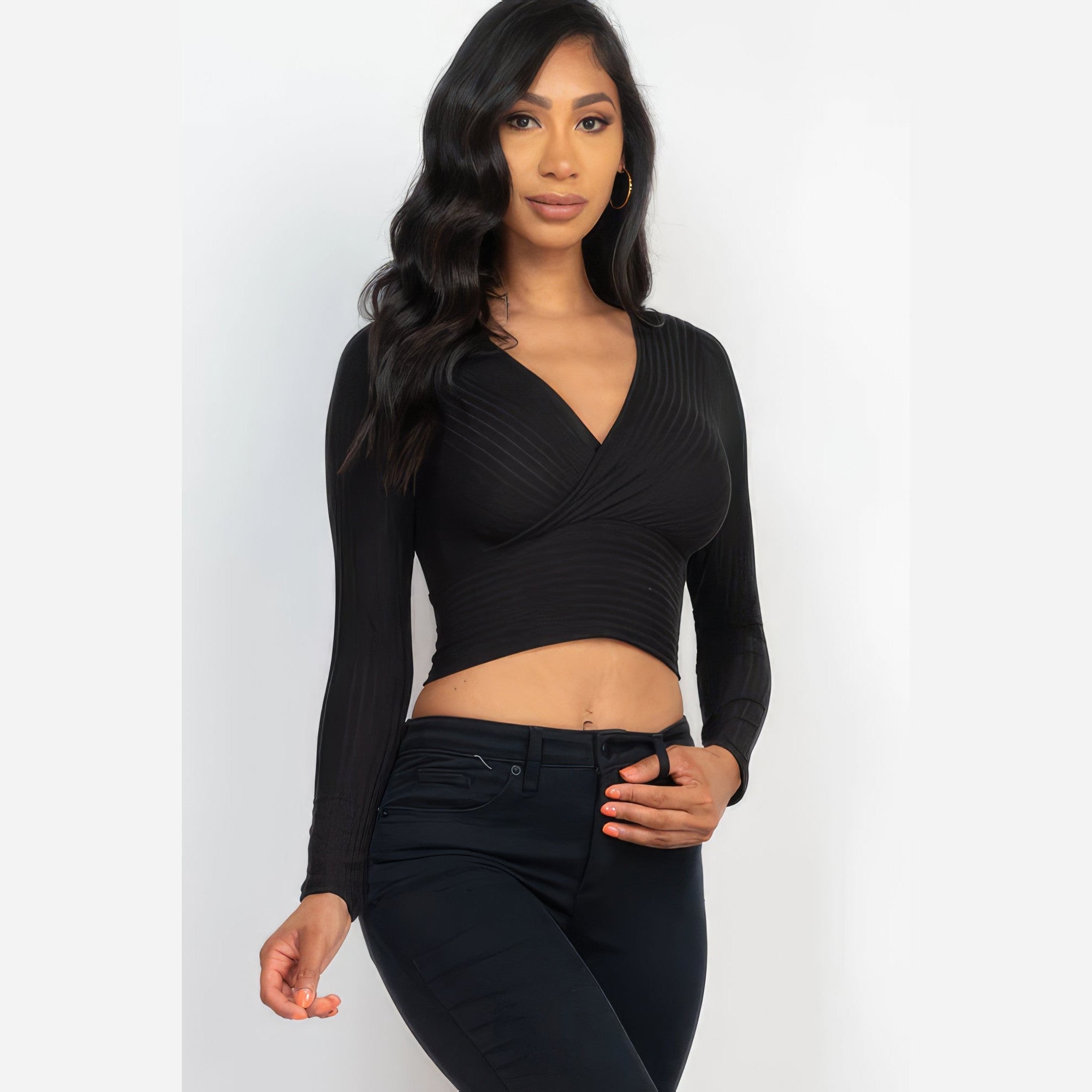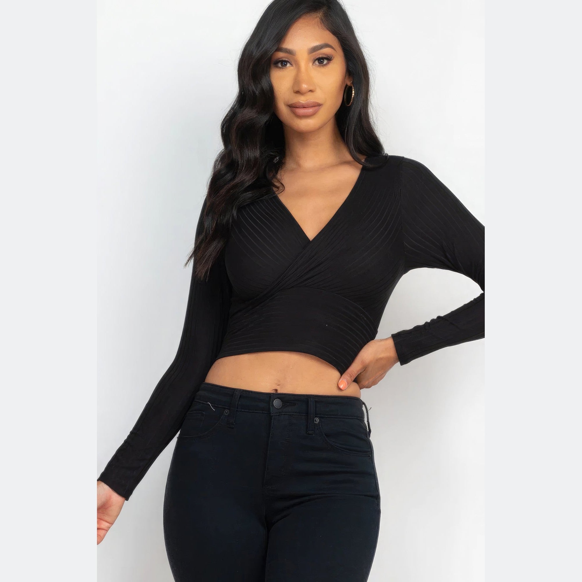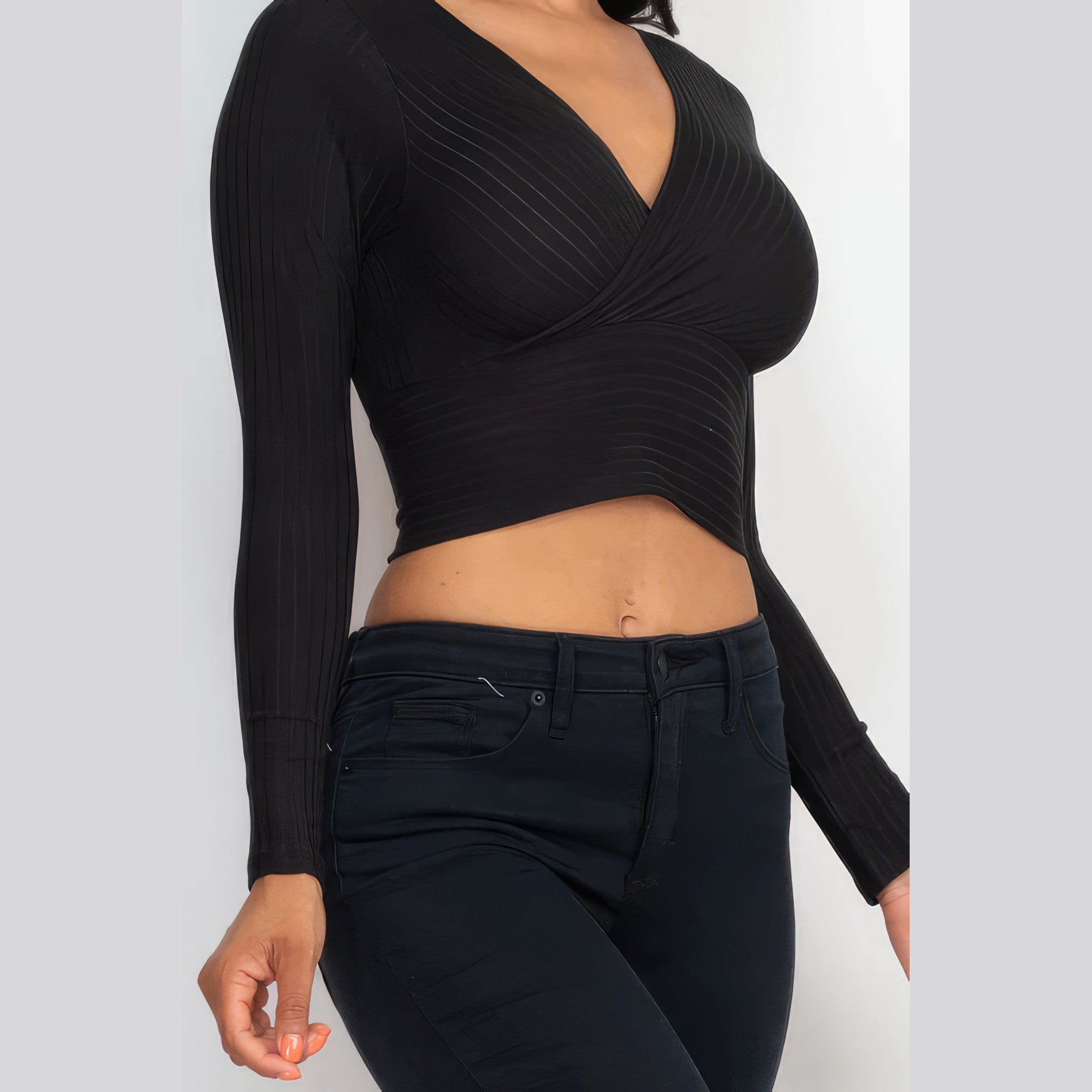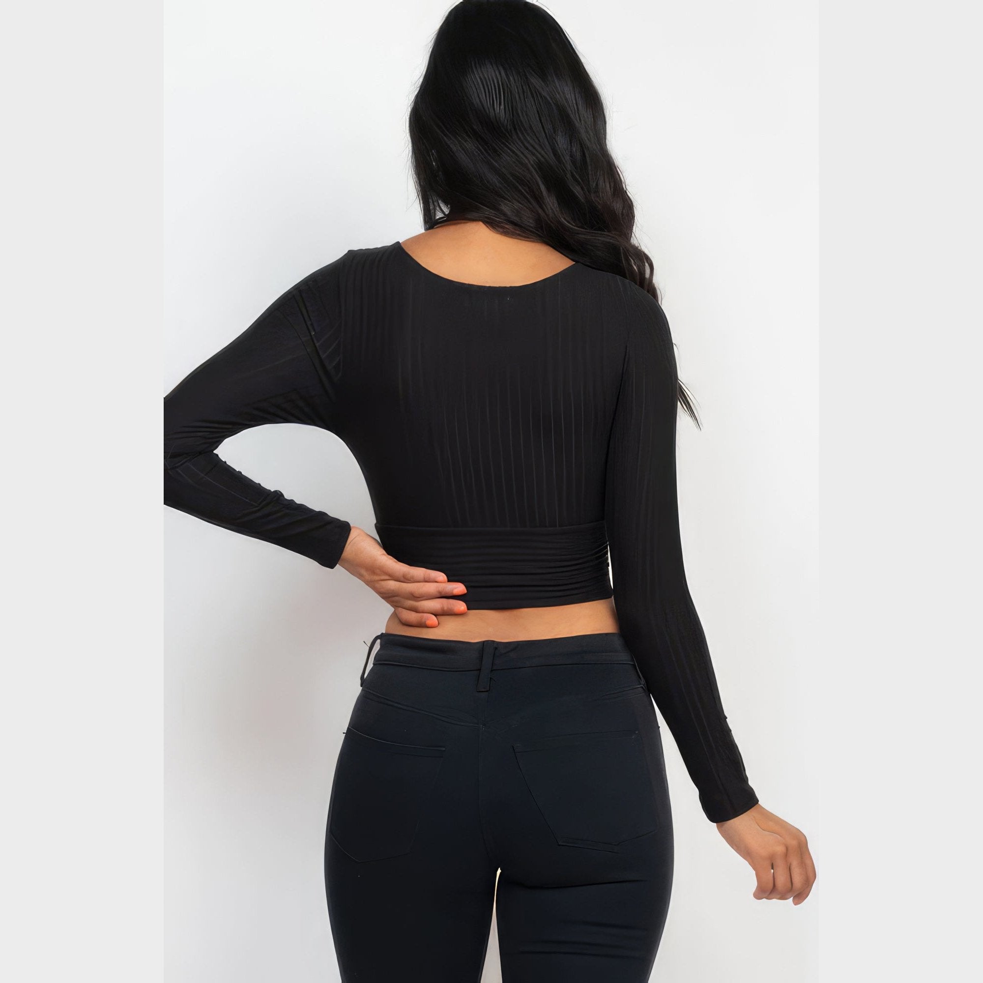 Add a touch of timeless elegance to your wardrobe. Order our Ribbed Wrap Front Long Sleeve Top in Black and experience the perfect blend of style and versatility!