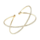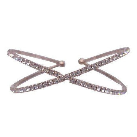 Ideal for both casual and formal occasions, the versatile design of this bracelet enhances its appeal. The crossed bangle jewelry style ensures a snug, comfortable fit while making a bold fashion statement. This bracelet glimmers in the light, highlighting the beauty of the rhinestones embedded along the sleek bands.