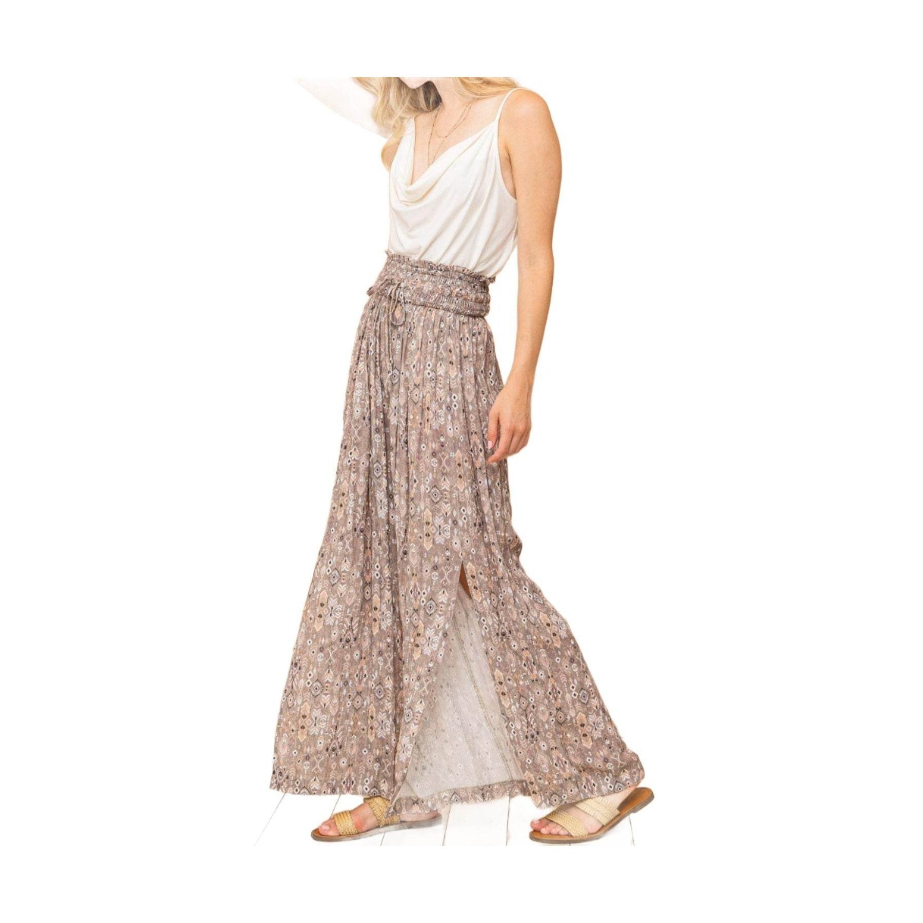Learn more about our And The Why Printed Smocked Waist Slit Wide Leg Pants at VacationGrabs: