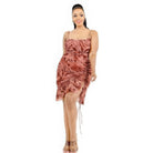This dress stands out for its bold animal print, adjustable cami straps, and playful ruffle hem. The stretchy fabric ensures a comfortable and flattering fit, making it a standout choice for any occasion where you want to showcase your style.