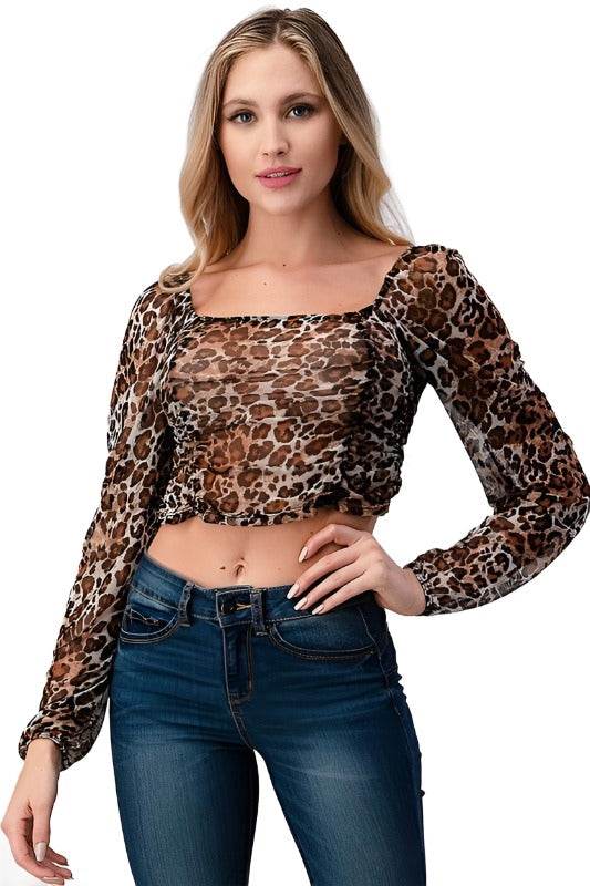 Crafted from lightweight mesh, this crop top ensures breathability and comfort. The leopard print adds a wild yet elegant touch, making it a standout piece in any outfit. Its cropped design is perfect for pairing with high-waisted jeans or skirts, offering endless styling possibilities.