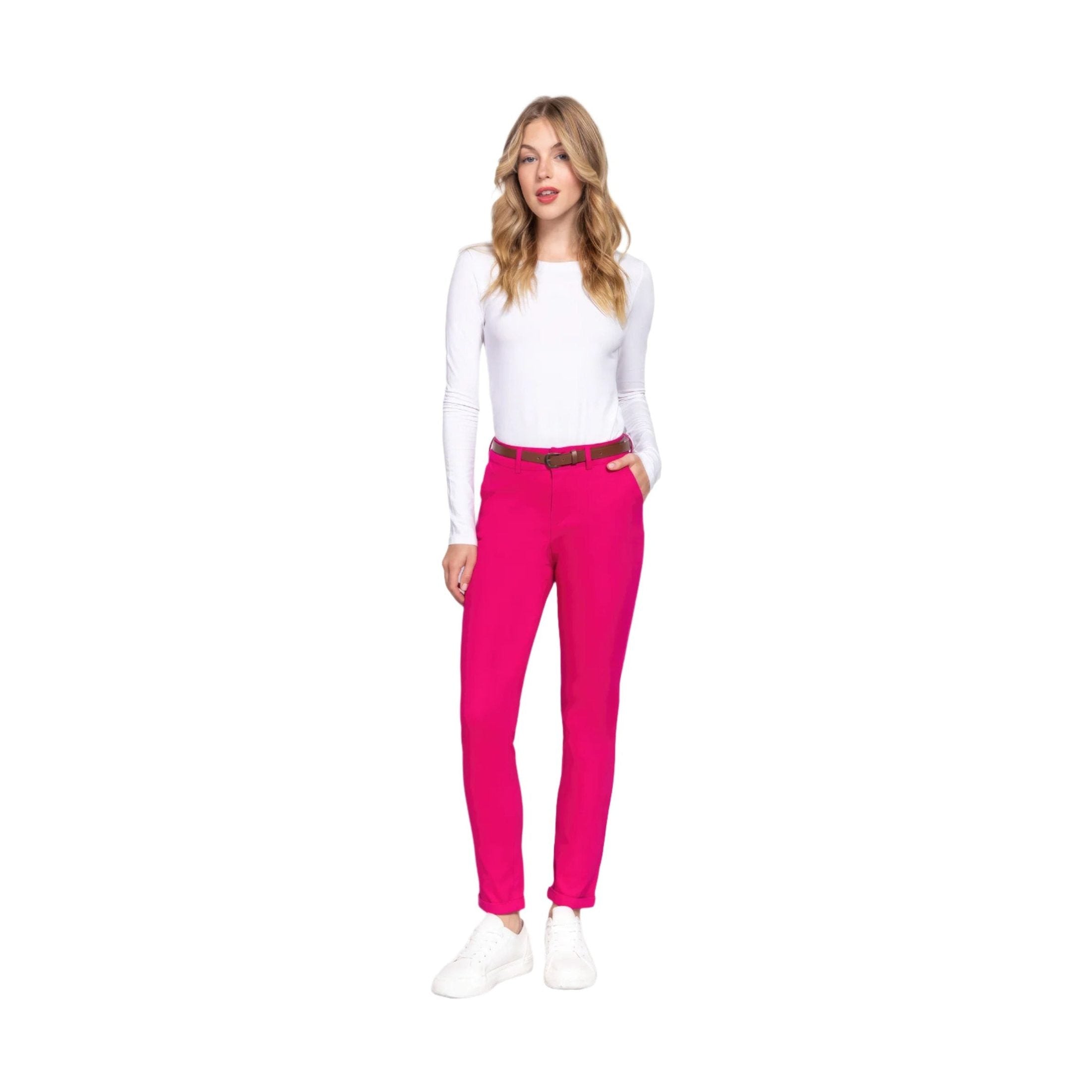 Magenta Cotton-Span Twill Belted Long Pants
