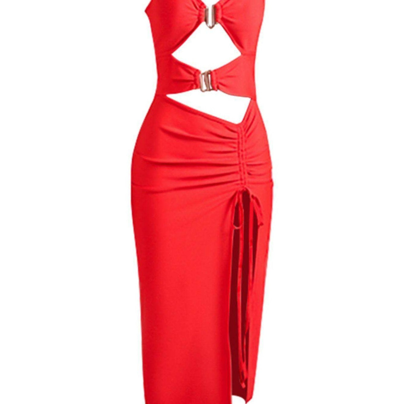 Learn more about our Cutout Strapless Drawstring Detail Split Bandage Dress at VacationGrabs: