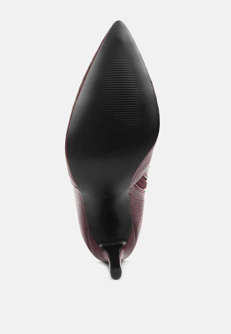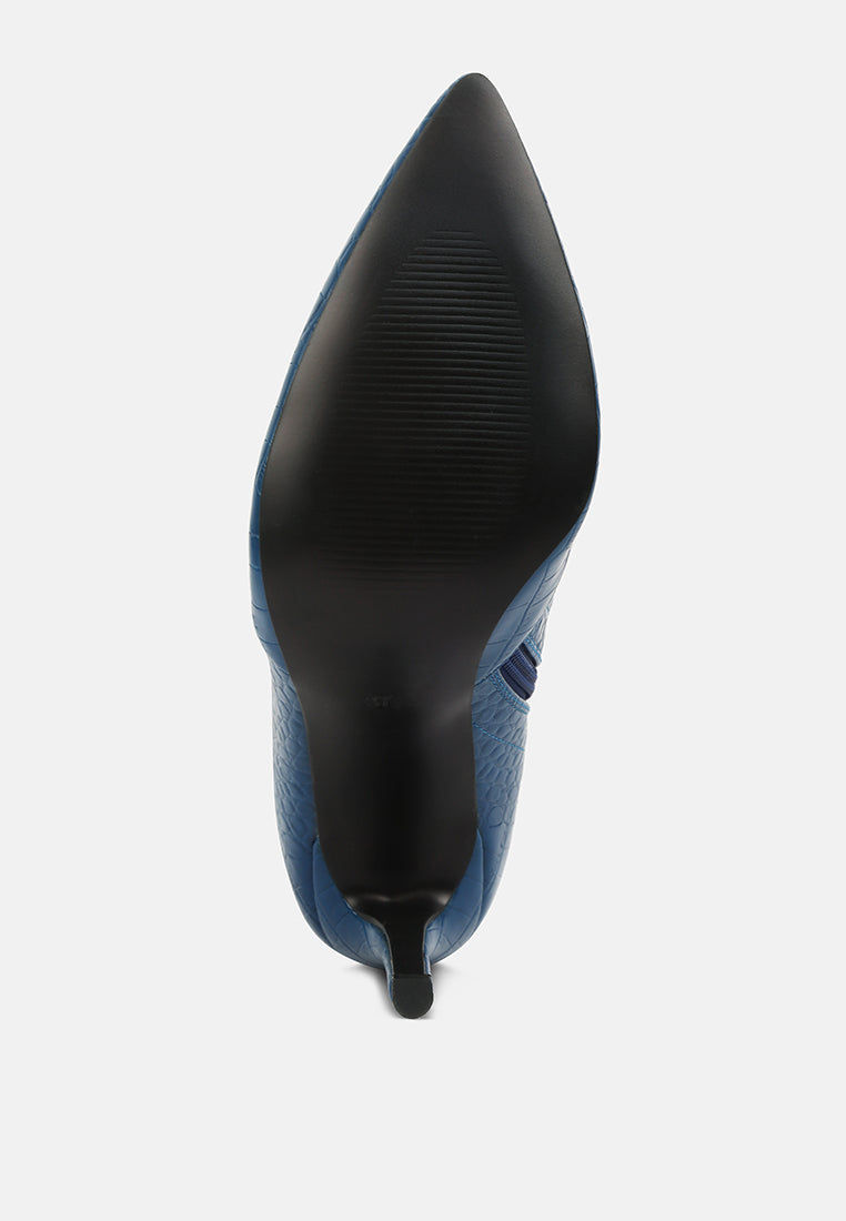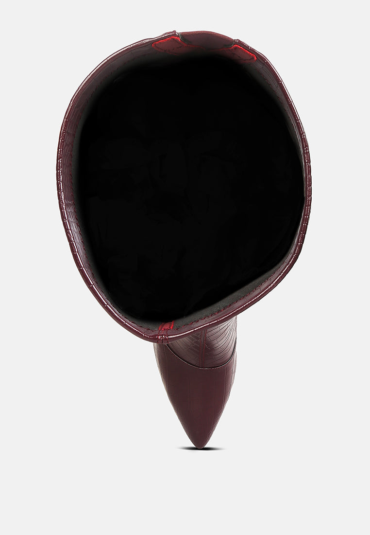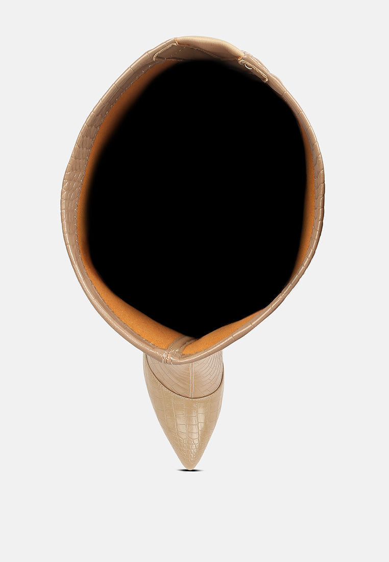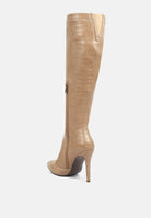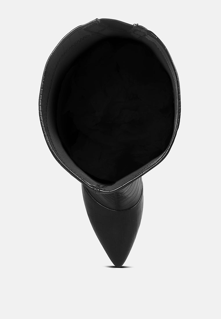 Calf High Boots in croc textured faux leather is a sharp and trendy design. Comes with a side zipper opening. The pointed heel boot with pointed toes will glam up your look with zero effort.