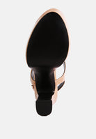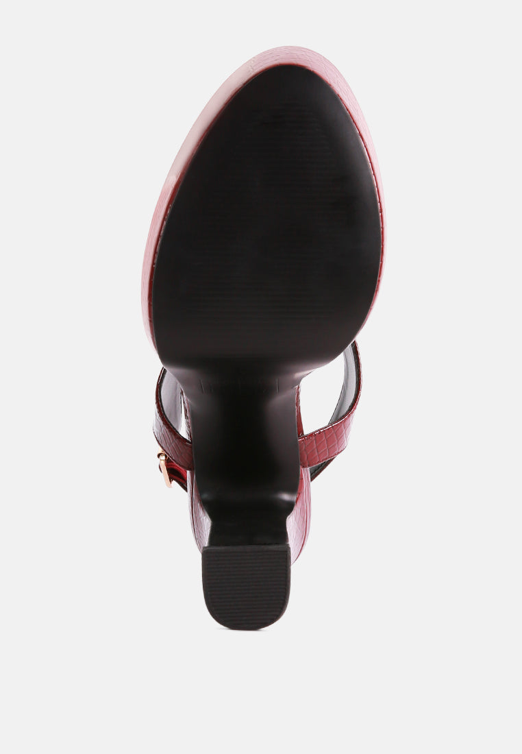 Style blazing cut out sandals are must for your closet: ultra high heeled block sandals in croc textured faux leather. The superb construction and finish is for keeps! The dainty construction in enhanced with shiny metallic hardware.