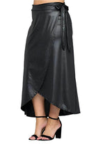 A Faux Leather Maxi Wrap Skirt which consists of the materials Polyester and Spandex.