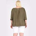 * Featuring Solid, 3/4 Sleeve, Ruffle Round Neck with button Back, Wast Length, Loose Fit, Solid Colors and Casual Style