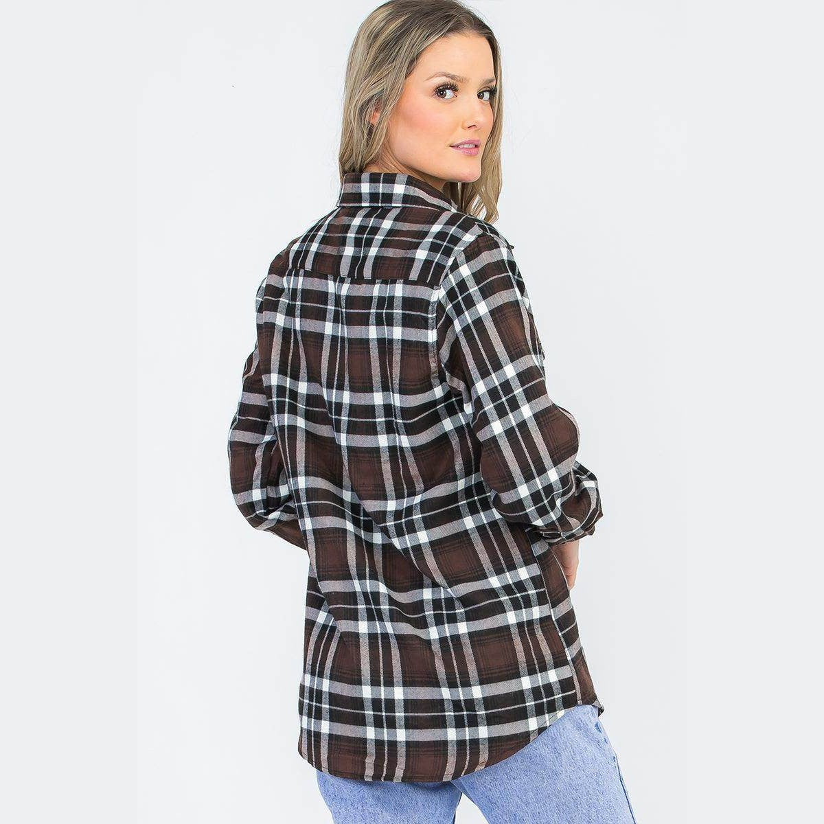 VacationGrabs Women's Brown Plaid Checkered Flannel Shirt