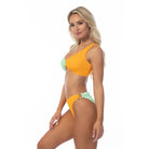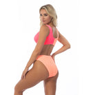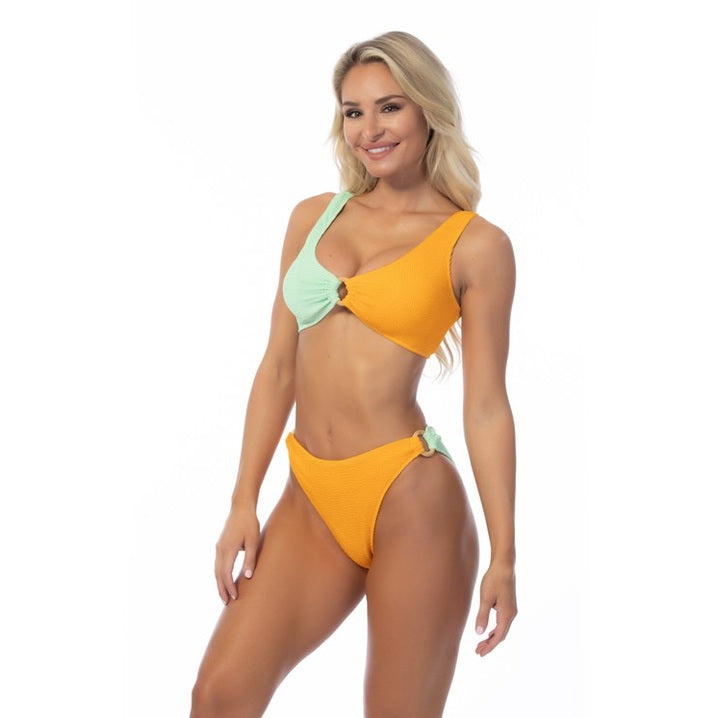 Stand out by the pool or at the beach with the Textured Two Tone Ring Accent Bikini Set from Beach Joy Bikini. This stylish vacation bikini set offers a bold look with its two-tone design. The textured fabric feels soft and comfortable. Its ring accent front adds a unique touch that catches the eye. The top gives a secure fit with its wide straps and supportive band.