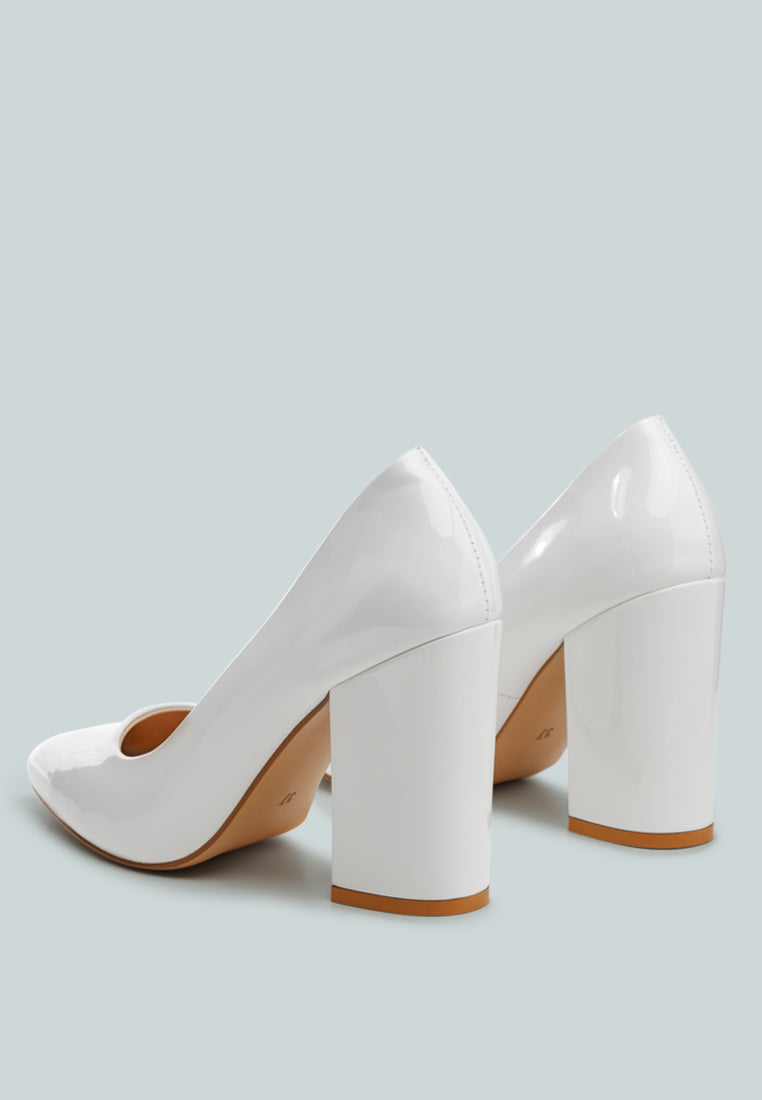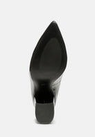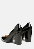 Achieve a polished look with these patent faux leather closed pointed toe high block heel pumps. These sophisticated heels are ideal for both professional and formal settings, offering classic style and all-day comfort.