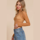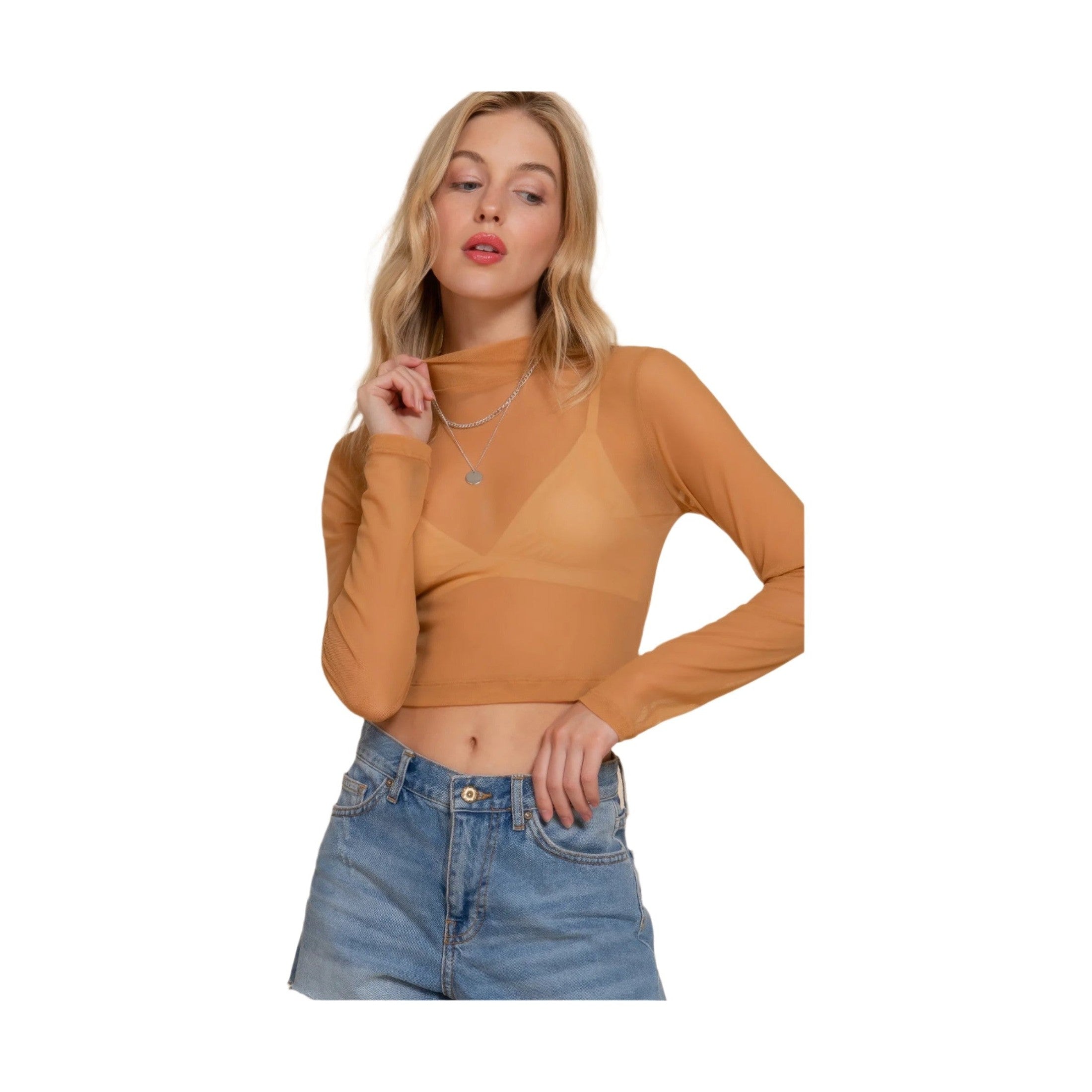 Enhance your wardrobe with our Long Sleeve Mock Neck Mesh Top in sophisticated khaki. Add versatility and effortless style to your look with this essential piece!
