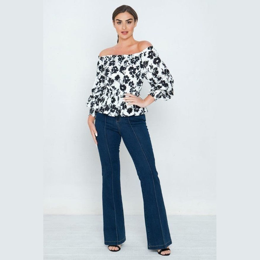 Experience the perfect blend of comfort and style that sets this printed shirt apart. The combination of the off-shoulder neckline, smocked cuffs, elasticized waist, and the classic Black color adds a trendy and fashionable touch to your wardrobe.