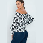 Add the Long Sleeves Off-Shoulder Neckline Printed Shirt in Black to your cart now and elevate your style with this chic and comfortable piece!