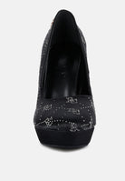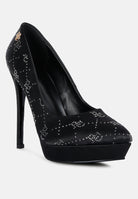 Let 'BALLARD' sing praises for you: beautiful high heeled satin pumps with raised platform has heat set embellishments in a drop lattice pattern. The Rag & Co. Monogram intrigues and is a feature of this limited handcrafted fashionable dress sandals.